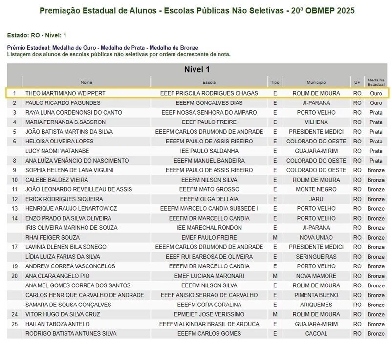 O estudante Theo Martimiano Weippert, aluno do Colégio Tiradentes da Polícia Militar de Rondônia, unidade de Rolim de Moura, alcançou um resultado de grande destaque na 20ª edição da Olimpíada Brasileira de Matemática das Escolas Públicas. Em 2025, ele conquistou Medalha de Ouro na premiação estadual e Medalha de Prata na etapa nacional, no Nível 1, voltado a alunos do 6º e 7º anos do ensino fundamental.