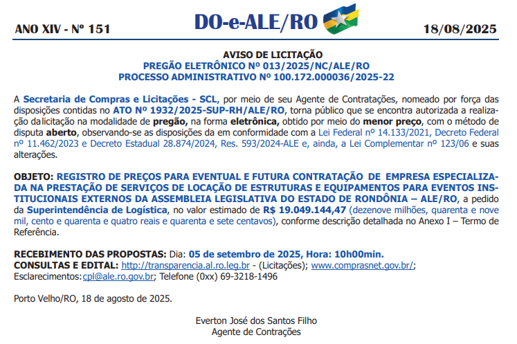 Todo o processo é público e acompanhado pela população por meio do portal da transparência da Assembleia e do portal nacional de compras, e dúvidas podem ser enviadas para [email protected] ou pelo telefone (69) 3218-1496. A licitação segue a Lei 14.133/2021, a nova Lei de Licitações, que trouxe mais transparência, agilidade e oportunidades para pequenas empresas.