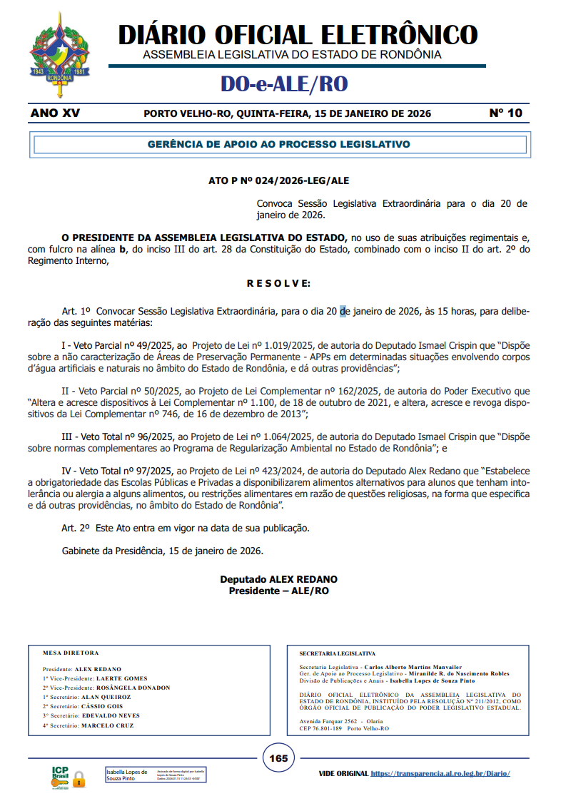Também serão apreciados o veto total ao Projeto de Lei nº 1.064/2025, que trata de normas complementares ao Programa de Regularização Ambiental no Estado de Rondônia, e o veto total ao Projeto de Lei nº 423/2024, que estabelece a obrigatoriedade de escolas públicas e privadas disponibilizarem alimentos alternativos para alunos com intolerância, alergia ou restrições alimentares por motivos religiosos.