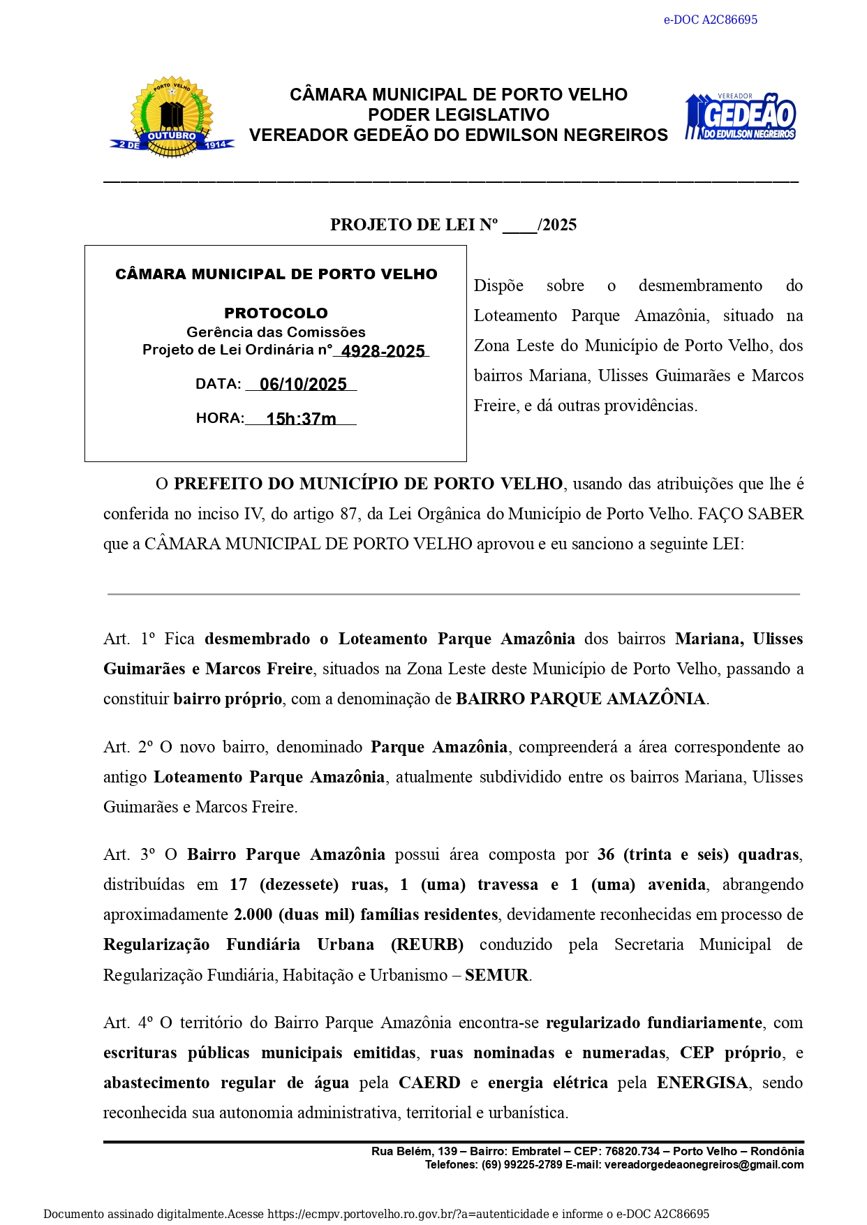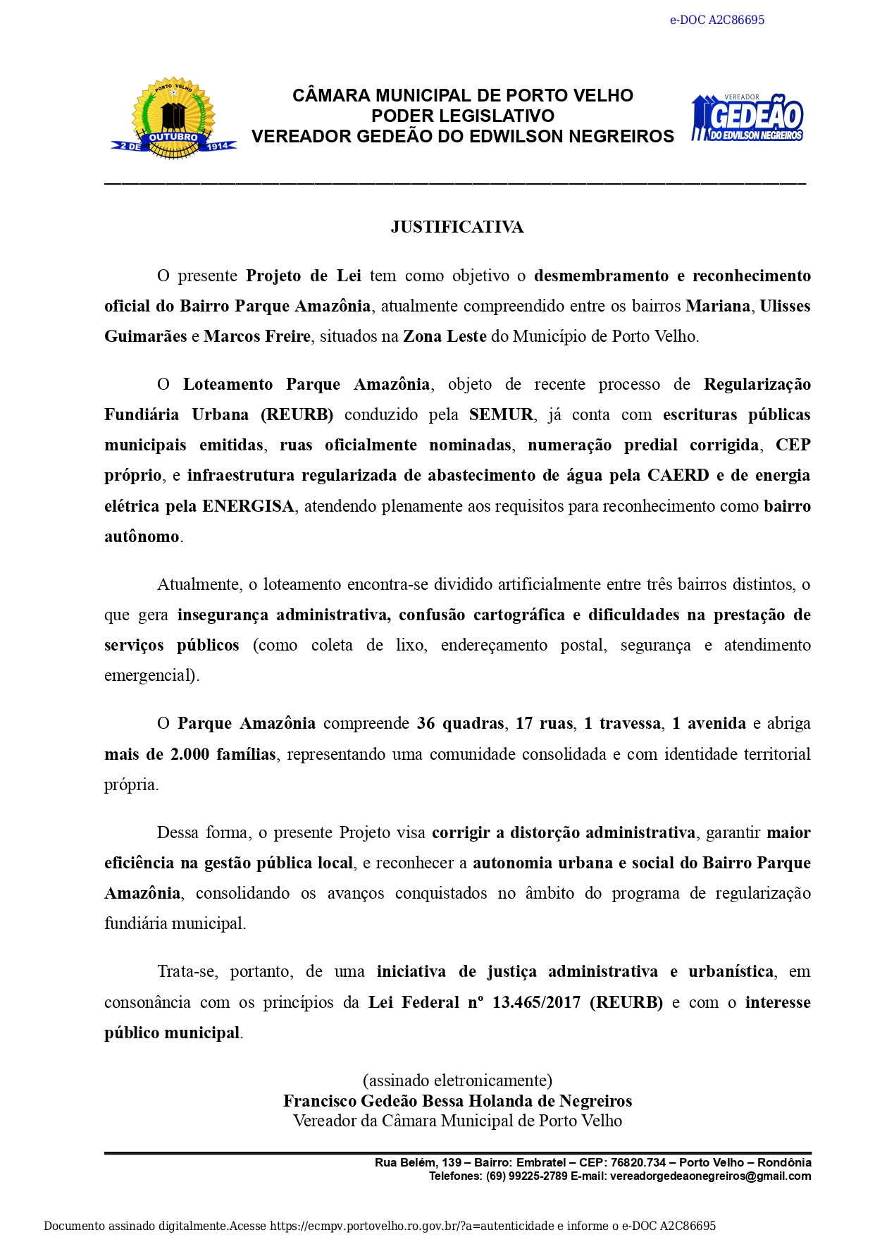 A Câmara Municipal de Porto Velho aprovou o Projeto de Lei que oficializa o desmembramento do Loteamento Parque Amazônia dos bairros Mariana, Ulisses Guimarães e Marcos Freire, reconhecendo o local como novo bairro da capital. A proposta, apresentada pelo vereador Gedeão Negreiros, consolida a autonomia administrativa, territorial e urbanística da comunidade, que já possuía estrutura e documentação próprias.