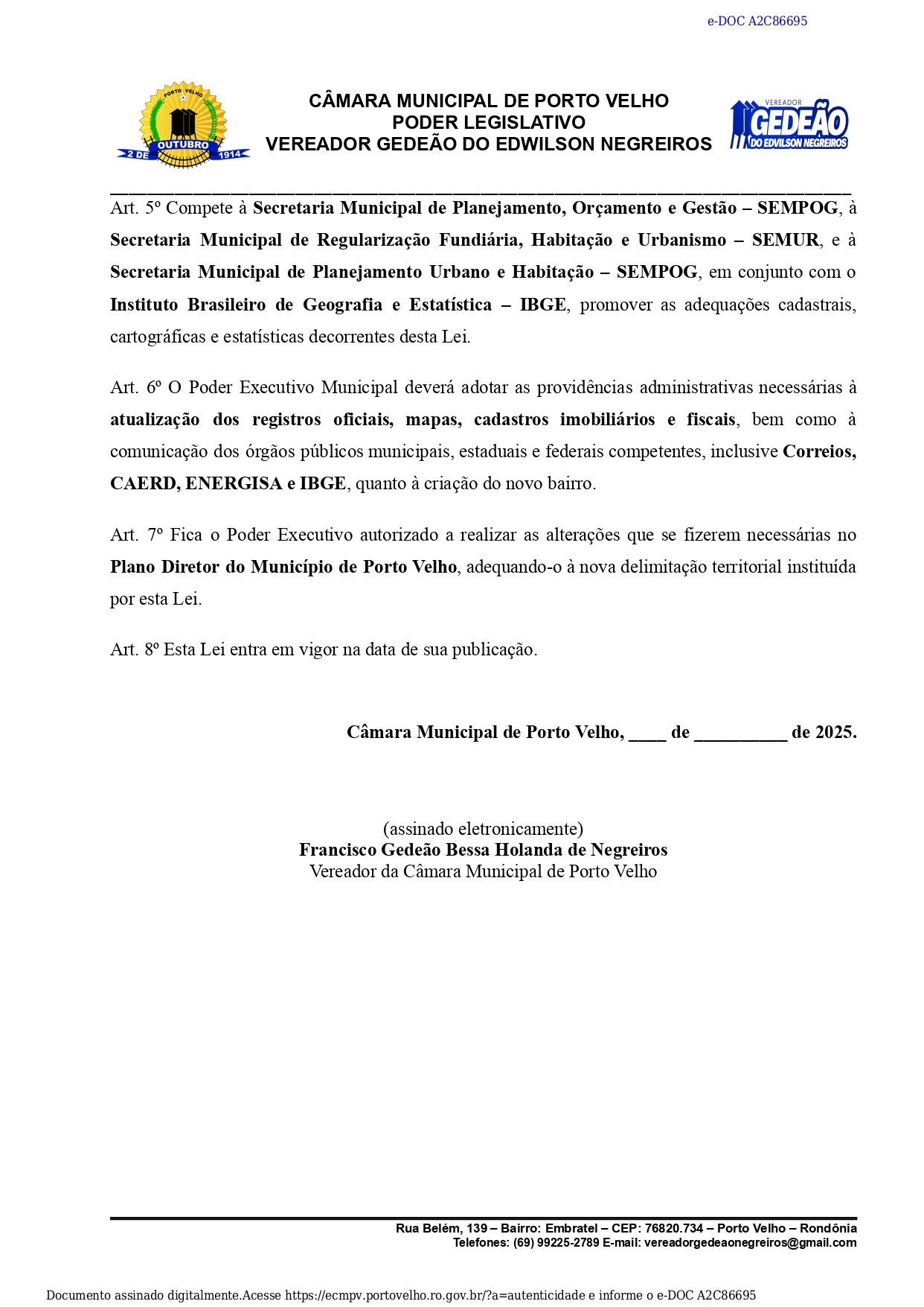 Com a sanção, a área composta por 36 quadras, distribuídas em 17 ruas, uma travessa e uma avenida, passa a integrar oficialmente o mapa urbano de Porto Velho, beneficiando aproximadamente 2 mil famílias já regularizadas por meio do programa REURB. O local conta com escrituras públicas, CEP próprio, ruas nomeadas, abastecimento de água e energia regularizados, além de infraestrutura urbana consolidada.