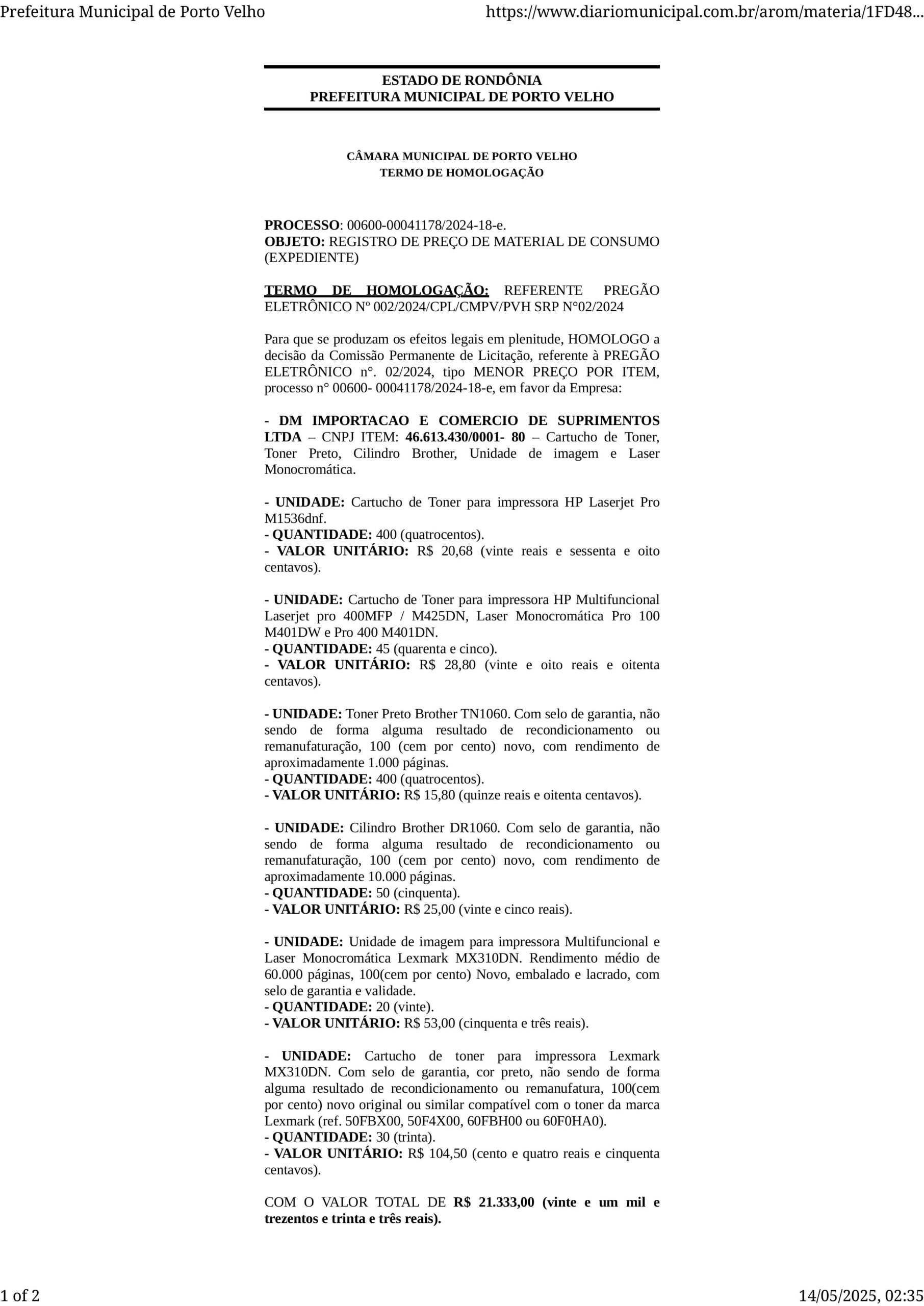 A Câmara Municipal de Porto Velho homologou no dia 7 de maio de 2025 o resultado do Pregão Eletrônico nº 002/2024, referente ao processo nº 00600-00041178/2024-18-e, que trata do registro de preços para aquisição de materiais de consumo (expediente), com foco em suprimentos de impressão.