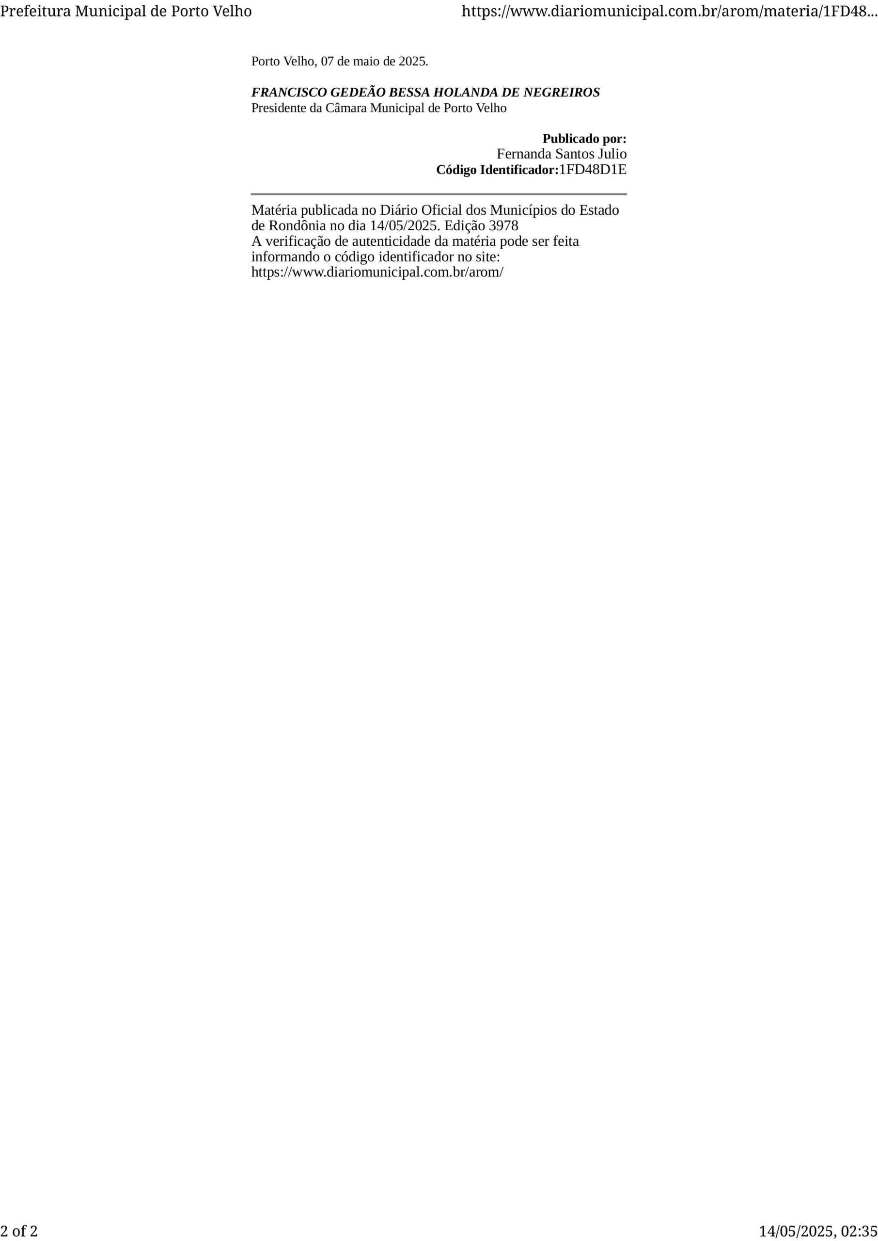 O valor total homologado é de R$ 21.333,00. A homologação foi assinada pelo presidente da Câmara, Francisco Gedeão Bessa Holanda de Negreiros.