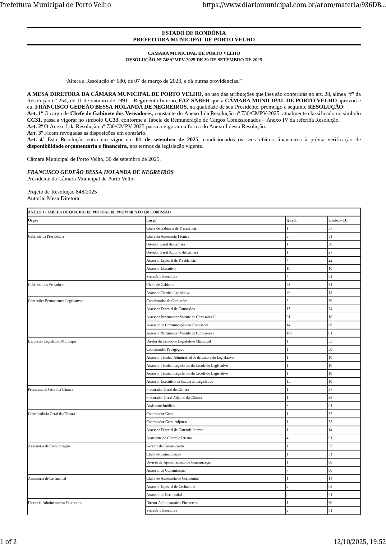 A Câmara Municipal de Porto Velho publicou no Diário Oficial dos Municípios de Rondônia, na edição de 9 de outubro de 2025, a Resolução nº 748/CMPV-2025, assinada pelo presidente Gedeão Negreiros. O ato altera o enquadramento do cargo de chefe de gabinete dos vereadores, que passa do símbolo CC31 para CC33, conforme a tabela de remuneração vigente.