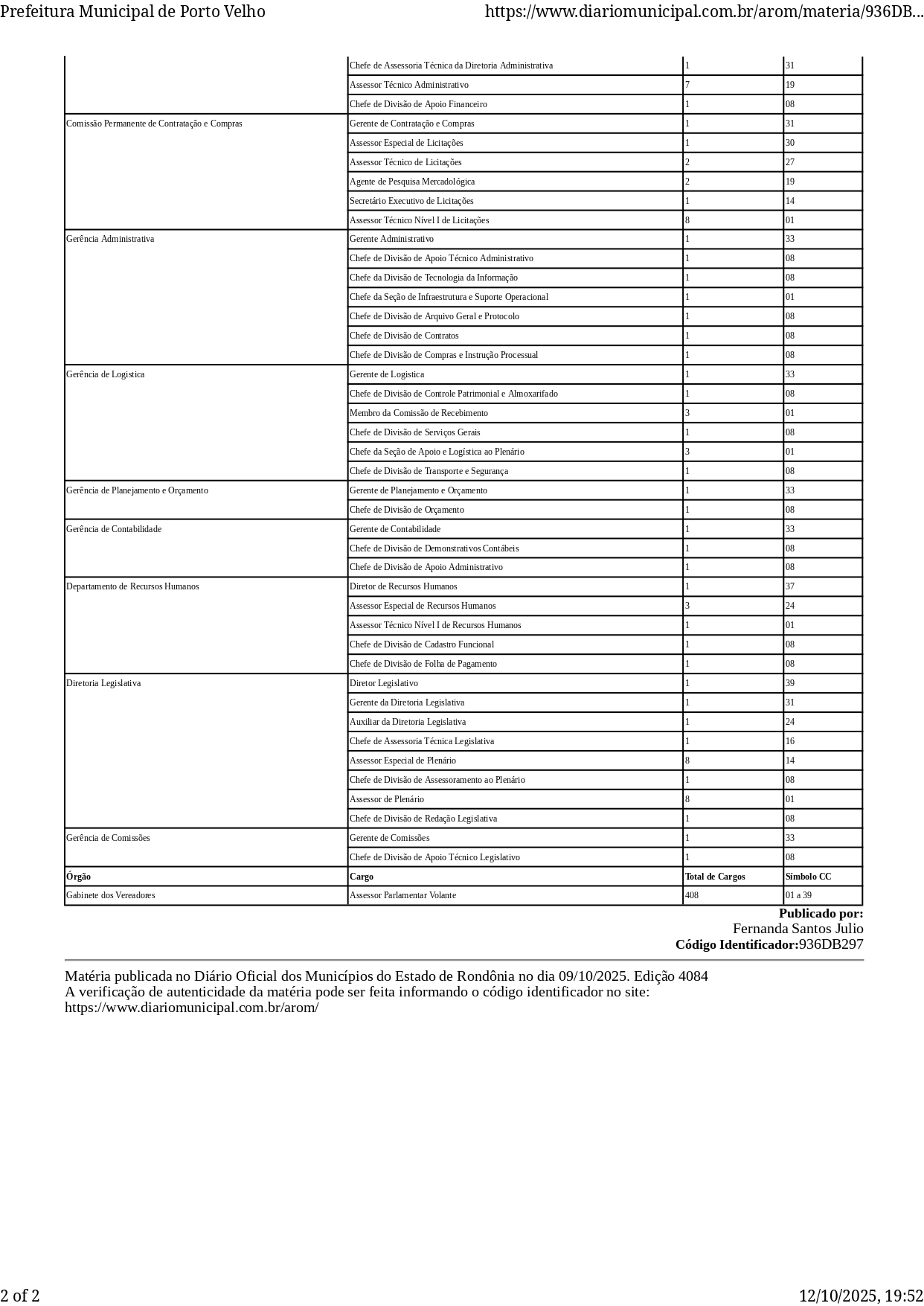 De acordo com o documento, outras funções da Casa, como assessores técnicos e administrativos, permanecem com os mesmos símbolos. A resolução revoga as disposições anteriores em contrário e mantém em vigor o restante da estrutura fixada pela Resolução nº 730/CMPV-2025.