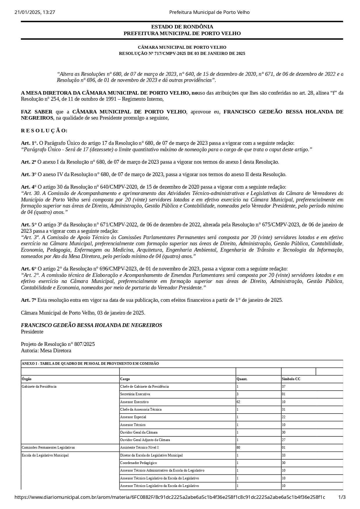 A Câmara Municipal de Porto Velho divulgou mudanças na estrutura de cargos e salários dos servidores comissionados, conforme a Resolução nº 717/CMPV-2025, publicada no Diário Oficial dos Municípios do Estado de Rondônia. As alterações têm efeitos retroativos a 1º de janeiro de 2025 e incluem uma nova tabela de cargos e remunerações, além de ajustes nas regras para composição de comissões legislativas.