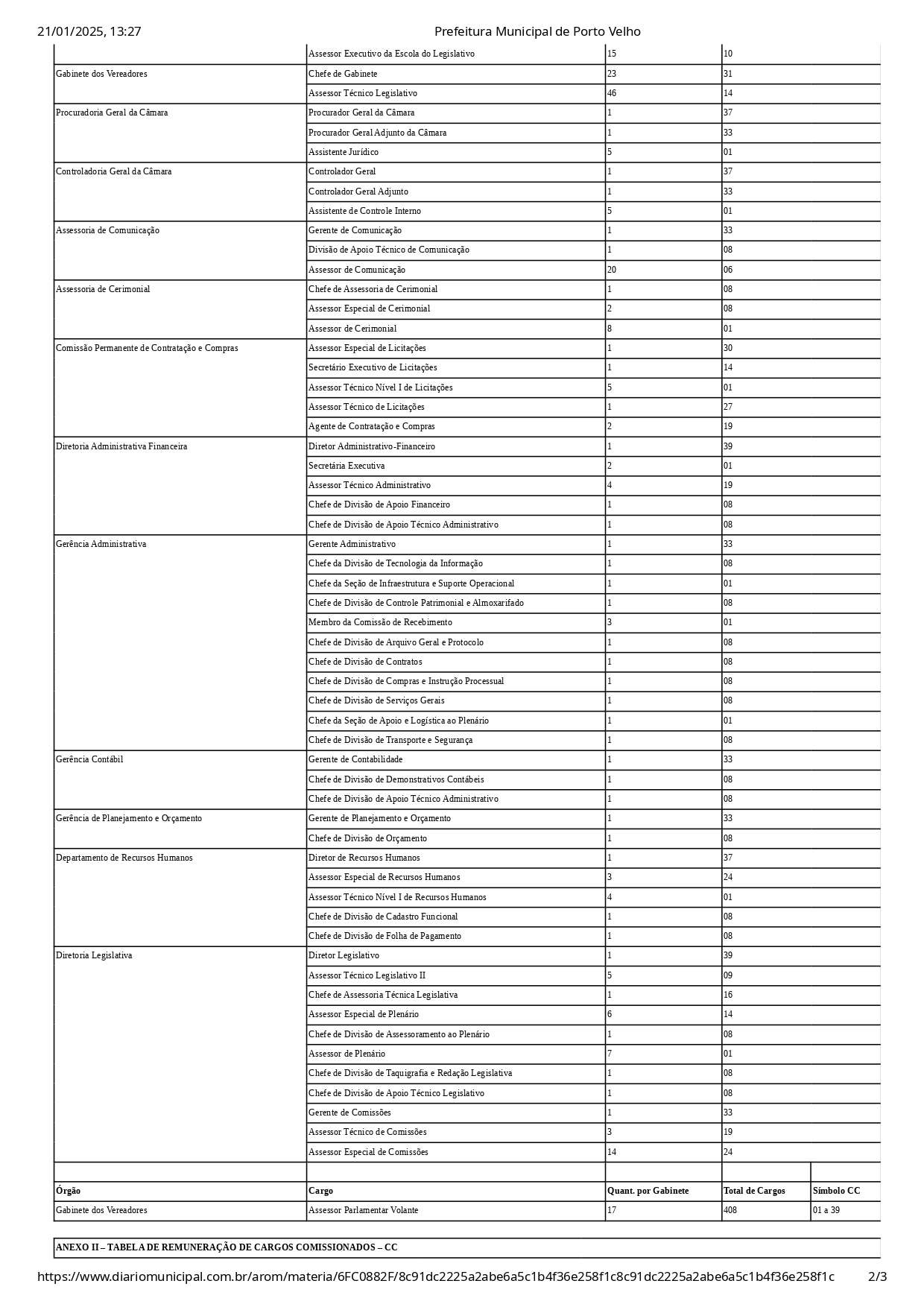 A nova tabela de cargos comissionados inclui 408 posições, distribuídas entre setores como o Gabinete da Presidência, Escola do Legislativo e Gabinete dos Vereadores. Os salários variam de R$ 1.520,00 a R$ 10.000,00, organizados por um sistema de símbolos que vai do nível 01 ao 39. Cargos de maior remuneração incluem o Chefe de Gabinete (R$ 9.000,00) e o Diretor Administrativo-Financeiro (R$ 10.000,00).