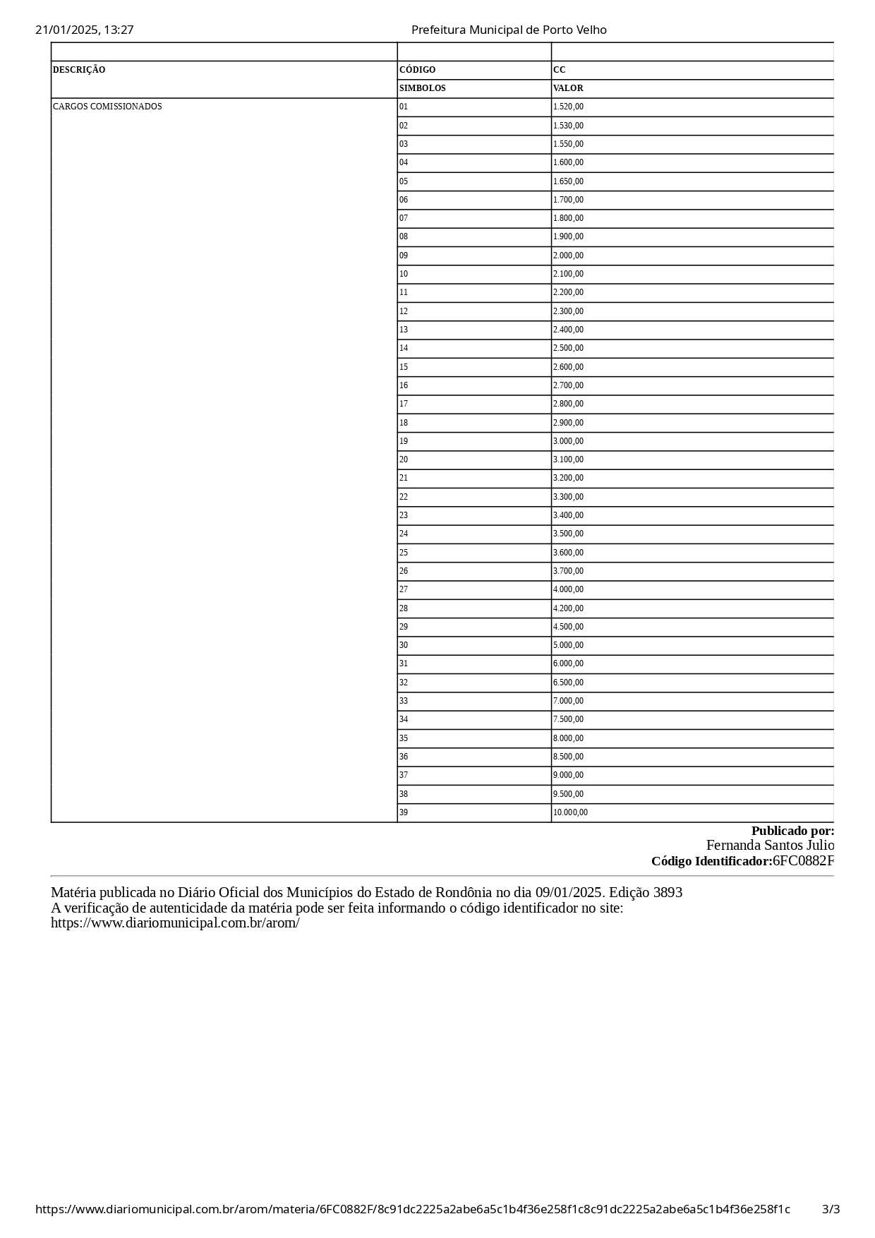 Os detalhes completos estão disponíveis no Diário Oficial dos Municípios do Estado de Rondônia, edição 3893, identificados pelo código 6FC0882F. O documento pode ser consultado para verificação das informações.