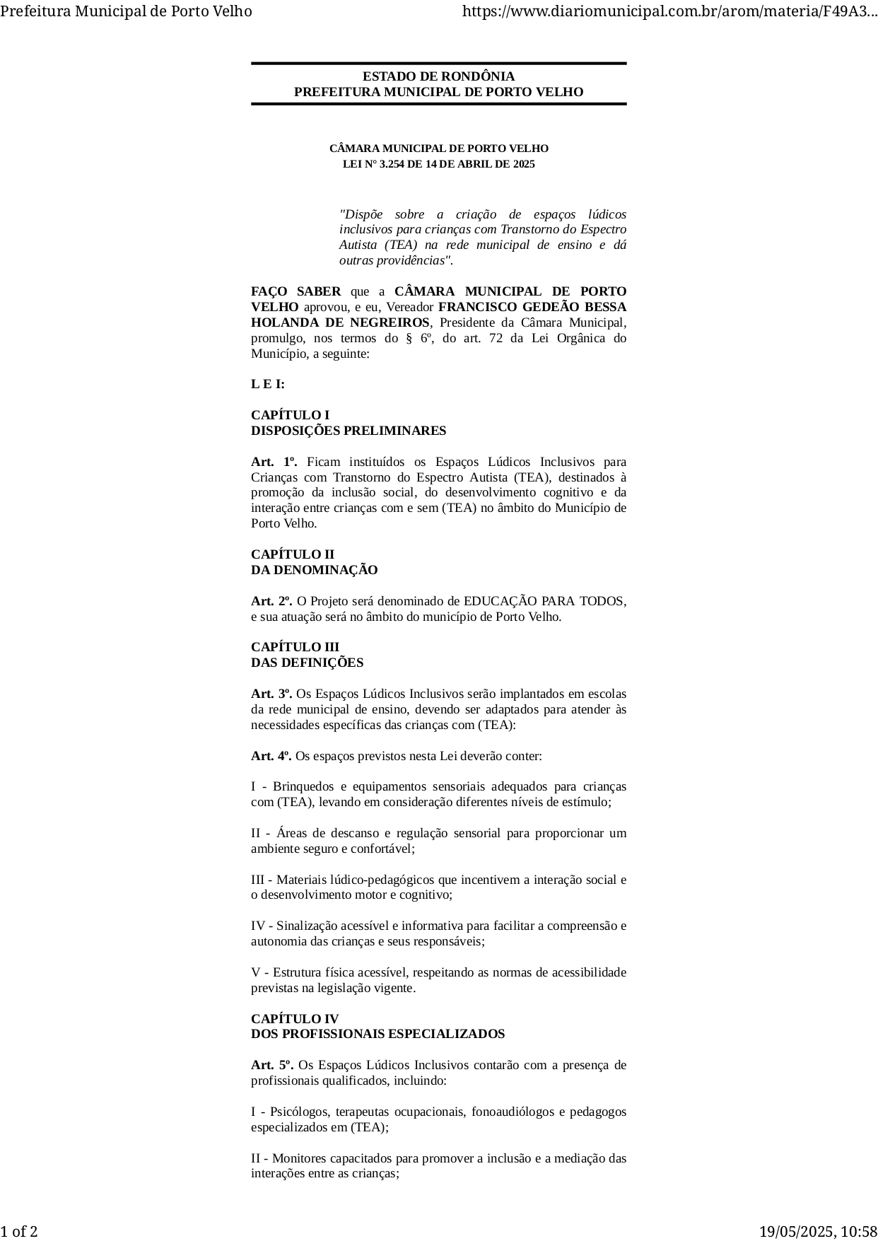 Porto Velho (RO) — A Câmara Municipal de Porto Velho promulgou a Lei nº 3.254, de 14 de abril de 2025, de autoria do vereador Nilton Souza (PSDB), que institui os Espaços Lúdicos Inclusivos para crianças com Transtorno do Espectro Autista (TEA) na rede municipal de ensino. A promulgação ocorreu após o projeto ter sido vetado pelo prefeito, sendo restituído pelo Legislativo com base no §6º do art. 72 da Lei Orgânica do Município.