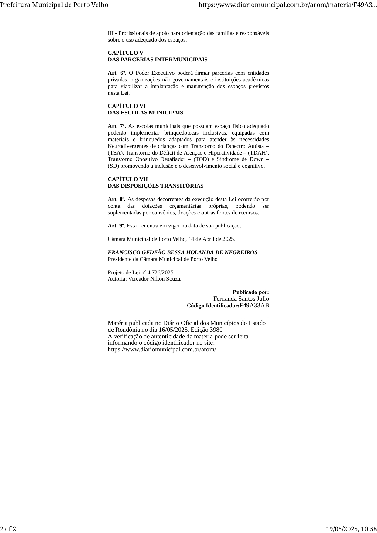 O projeto, registrado sob o número 4.726/2025, foi publicado no Diário Oficial dos Municípios do Estado de Rondônia na edição de 16 de maio de 2025, com o código identificador F49A33AB.