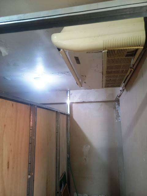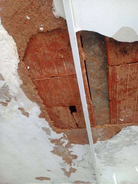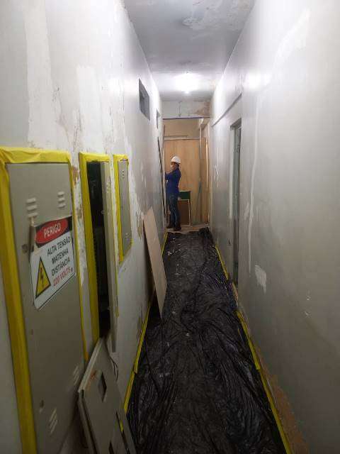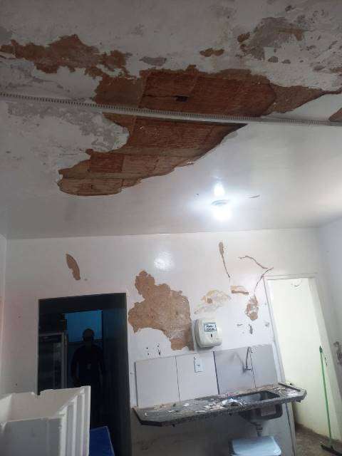 Uma das coisas mais preocupantes foi a falta de isolamento na área em reforma, colocando todo mundo em risco. Por exemplo, parte do forro de gesso está faltando, e ainda tem infiltrações causadas pela chuva em uma laje descoberta, que podem danificar a fiação elétrica e causar acidentes.