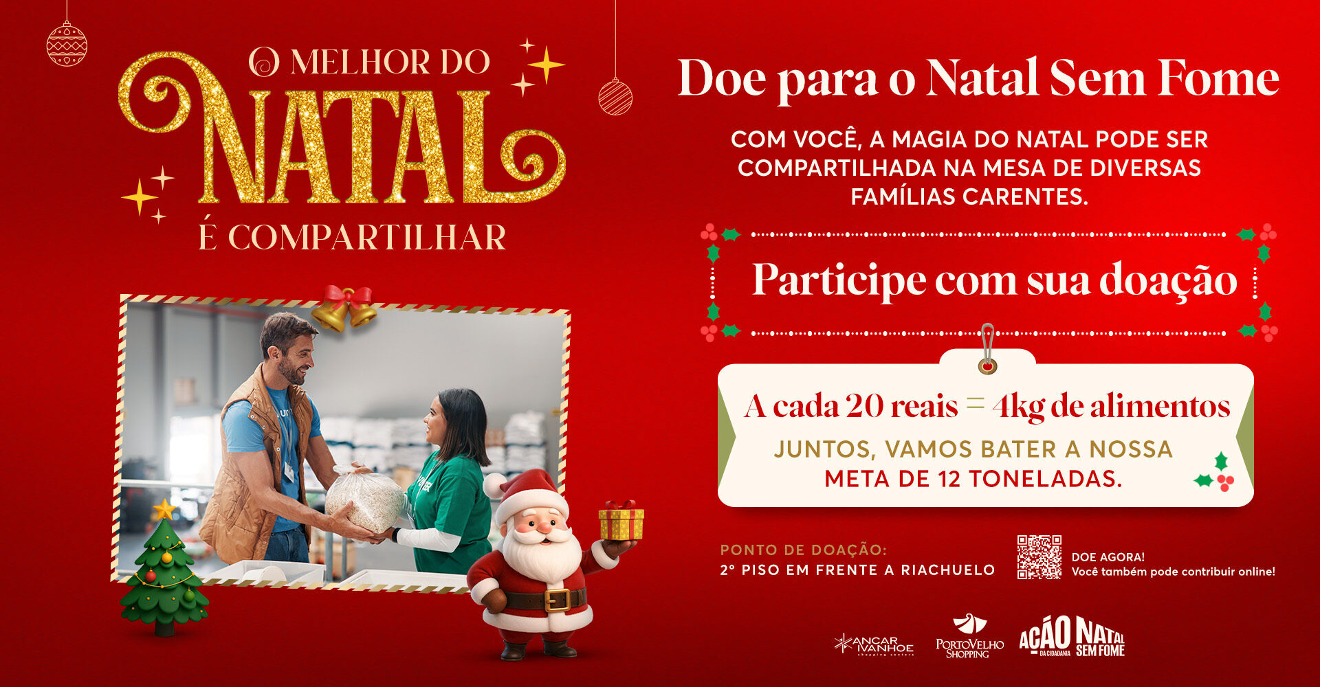 As doações podem ser feitas no ponto de coleta no 2º piso, em frente à Riachuelo, ou de forma online, acessando https://natalsemfome.ancar.com.br/portovelhoshopping. Cada R$ 20 doados equivalem a 4 kg de alimentos.