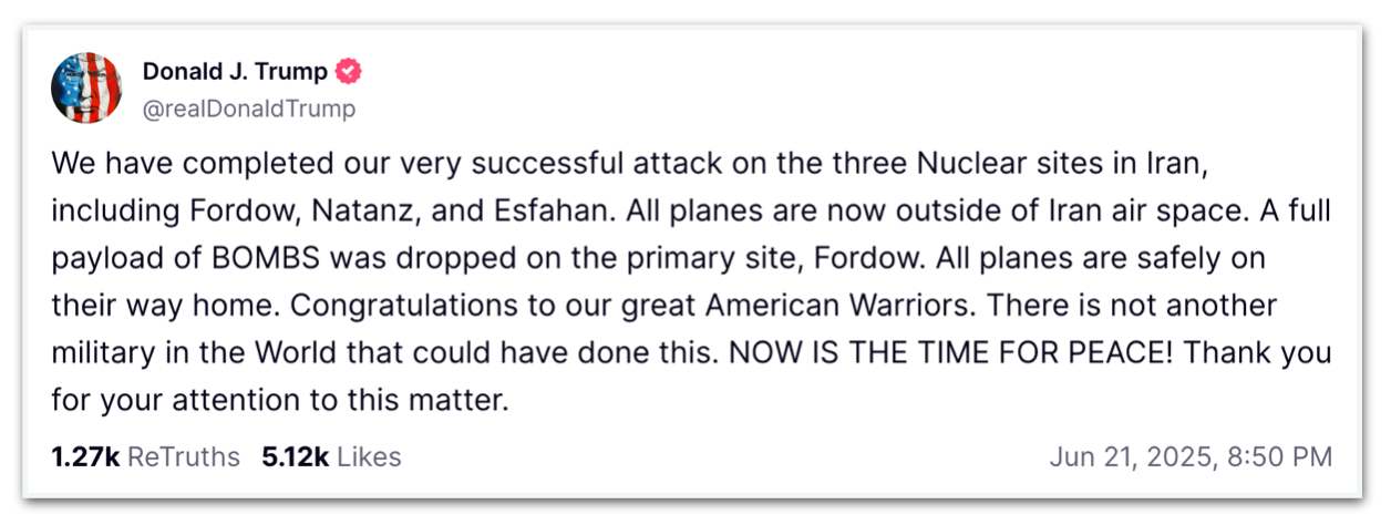 Segundo Trump, os bombardeios atingiram alvos estratégicos nas cidades iranianas de Fordow, Natanz e Esfahan. A declaração foi feita em sua conta na rede social Truth Social, onde o presidente descreveu a operação como “bem-sucedida” e informou que as aeronaves envolvidas já haviam deixado o espaço aéreo iraniano e estavam retornando aos Estados Unidos.