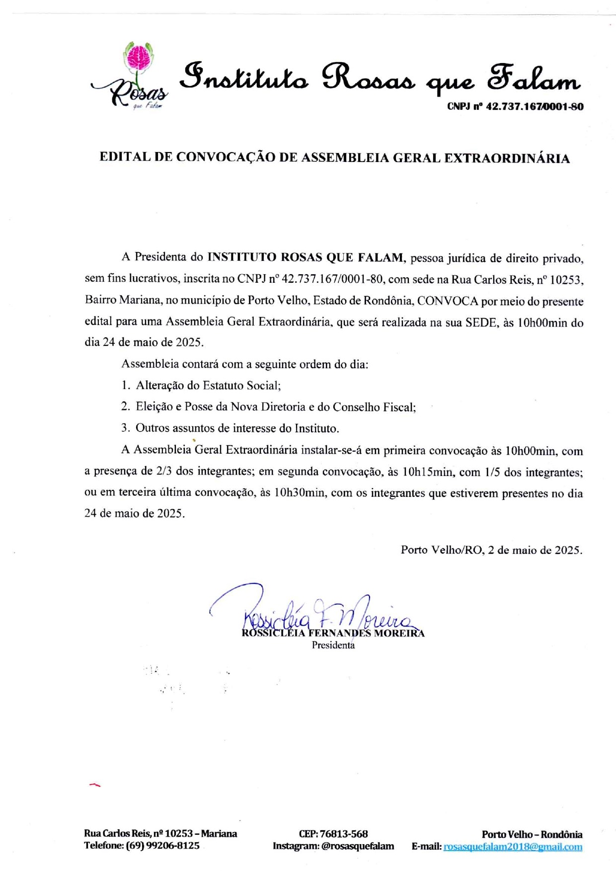 Porto Velho (RO) – O Instituto Rosas Que Falam, entidade sem fins lucrativos com sede no Bairro Mariana, Porto Velho, publicou edital de convocação para a realização de uma Assembleia Geral Extraordinária. O encontro acontecerá no dia 24 de maio de 2025, às 10h, na sede da instituição.