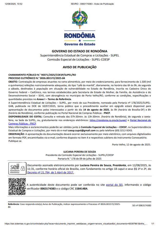 O Governo de Rondônia abriu nesta quarta-feira (14/08) o Chamamento Público n.º 90371/2025 para credenciar empresas aptas a fornecer até 1.500 cafés da manhã por dia, de segunda a sábado, a famílias em vulnerabilidade inscritas no CadÚnico, em Porto Velho. A execução será coordenada pela Secretaria de Estado da Assistência e do Desenvolvimento Social (SEAS). O edital fixa que o fornecimento ocorrerá das 06h às 09h, de segunda a sábado, nos estabelecimentos credenciados. O número de 1.500 refeições diárias está previsto no Anexo I – Termo de Referência do edital, resultado de estudo técnico da SEAS que definiu esse quantitativo como o limite máximo para a capital, considerando a demanda do CadÚnico.