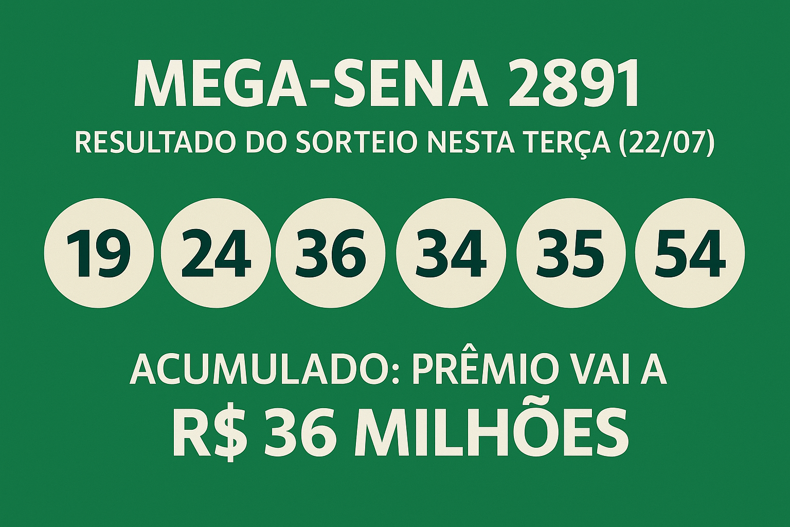 O concurso 2891 da Mega-Sena foi realizado na noite desta terça-feira, 22 de julho, no Espaço da Sorte, em São Paulo. Como ninguém acertou as seis dezenas sorteadas, o prêmio principal acumulou mais uma vez e está estimado em R$ 36 milhões para o próximo sorteio, que acontecerá na quinta-feira (24).