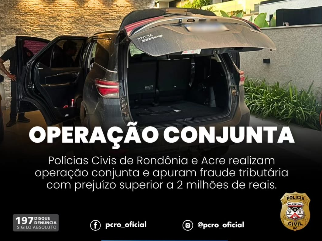 A Polícia Civil de Rondônia participou, nesta quinta-feira, 5, de uma operação conjunta com a Polícia Civil do Acre no município de Cacoal, no contexto de uma investigação que apura a existência de um esquema de fraude tributária responsável por prejuízo superior a R$ 2 milhões aos cofres públicos, investigação esta que vem sendo conduzida de forma articulada entre os dois estados diante da complexidade das operações identificadas.