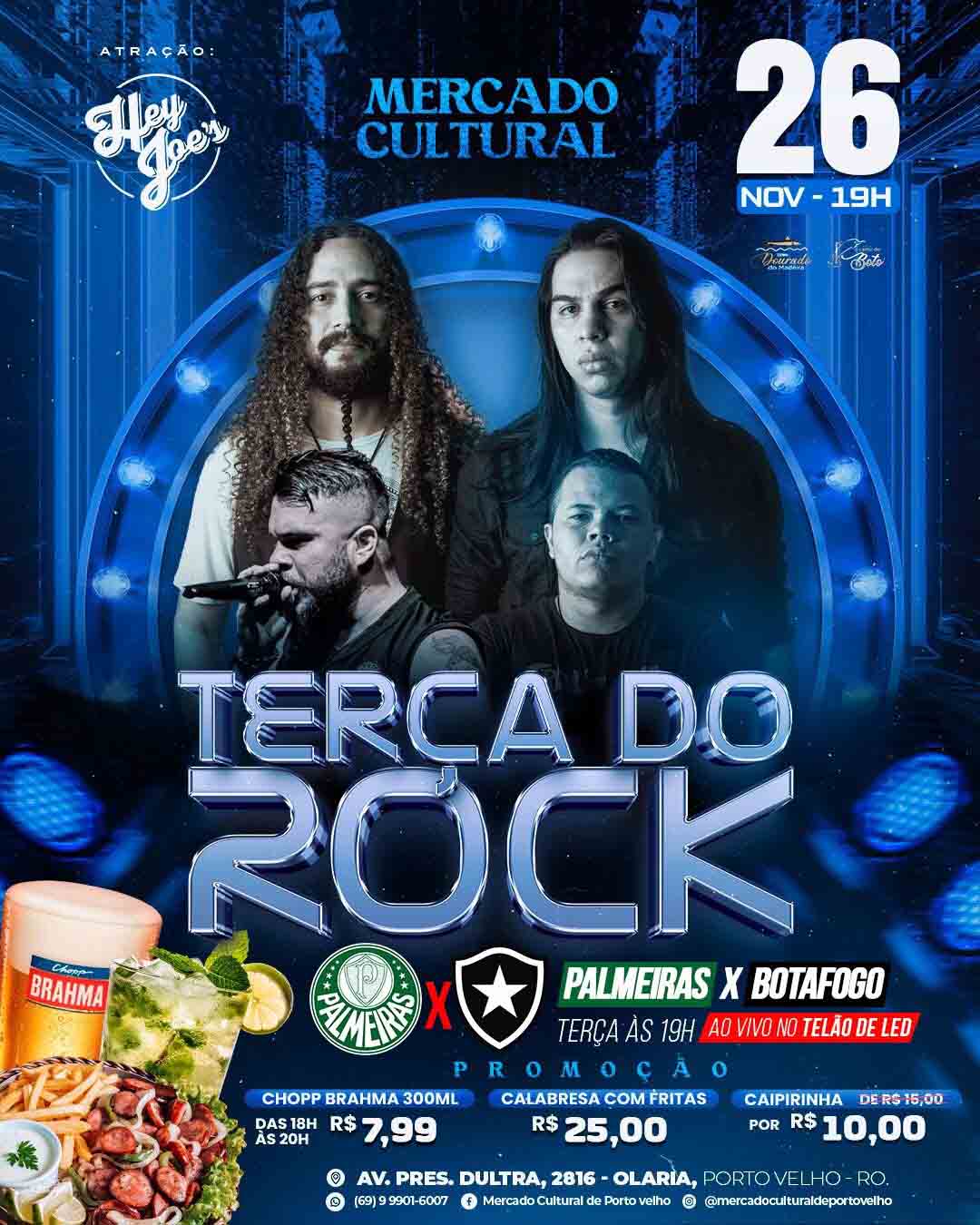 De acordo com o empresário, o show de hoje do tradicional evento de rock, será na parte externa do Mercado, com apresentação da banda Hey Joe’s. Já na parte interna, terá TV para transmissão do jogo do Flamengo X Fortaleza, e telão de Led para a transmissão do jogo do Botafogo X Palmeiras.