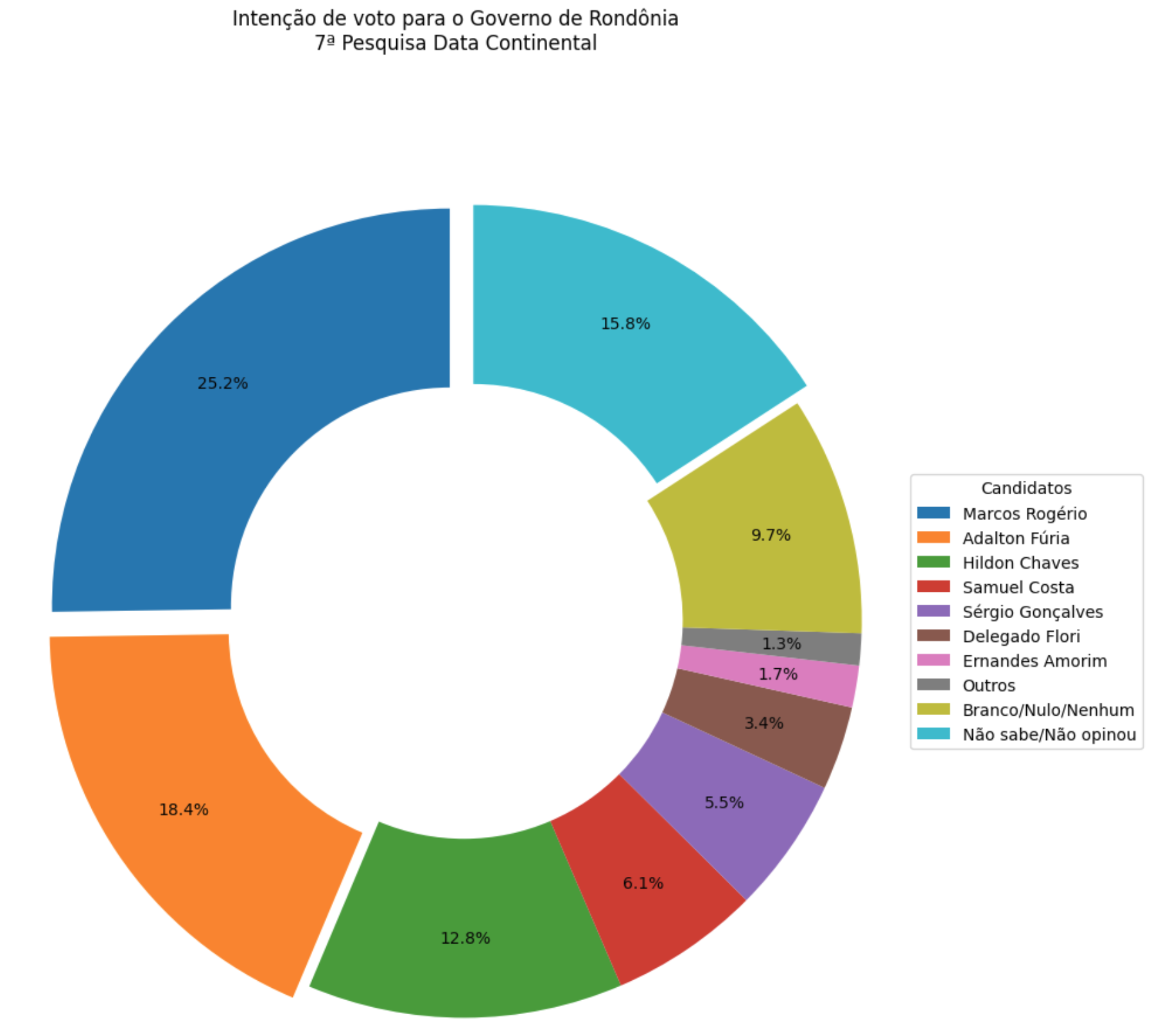 O Instituto Data Continental divulgou os resultados da 7ª Pesquisa de Opinião Pública sobre a sucessão ao Governo de Rondônia. A sondagem é quantitativa e estimulada. O estudo ouviu 1.888 eleitores entre os dias 20 e 26 de dezembro de 2025, em 15 municípios do estado. O nível de confiança é de 95%, com margem de erro de três pontos percentuais para mais ou para menos.