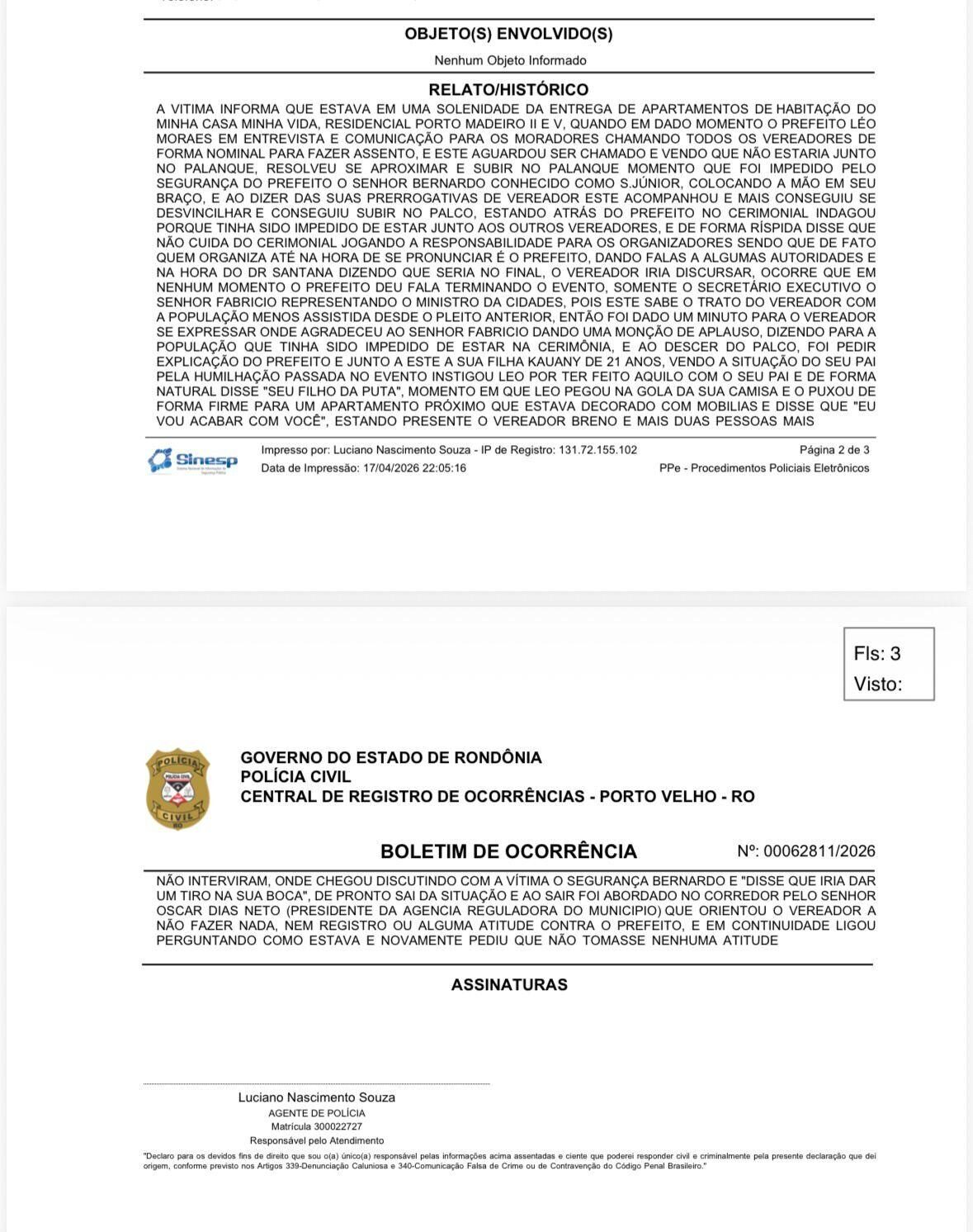 O que seria um episódio lamentável de falta de cortesia institucional se transformou em caso de polícia logo após o encerramento do evento. Conforme consta detalhadamente no Boletim de Ocorrência de número 00062811 de 2026, registrado na Central de Registro de Ocorrências da Polícia Civil do Estado de Rondônia, o vereador Santana desceu do palco e se dirigiu ao prefeito para pedir explicações sobre o tratamento recebido. Nesse momento, segundo o relato registrado no documento policial, Kauany, filha de 21 anos do prefeito, que presenciava a cena, teria se exaltado ao ver o pai sendo cobrado publicamente e utilizado expressão de grave baixo calão contra o vereador. O registro policial narra que, a partir desse instante, Léo Moraes teria agarrado o vereador Santana pela gola da camisa com força e proferido a ameaça direta e explícita de que iria acabar com ele, na frente do vereador Breno e de pelo menos mais duas pessoas presentes no local. O mesmo documento assinado pelo agente de polícia Luciano Nascimento Souza, matrícula 300022727, registra ainda que o segurança Bernardo teria ameaçado o parlamentar de morte, afirmando que iria dar um tiro na sua boca. O presidente da Agência Reguladora do Município, Oscar Dias Neto, que também presenciava os fatos, teria intervindo no corredor pedindo ao vereador que não tomasse nenhuma atitude contra o prefeito e que não registrasse nenhuma ocorrência policial, orientação que o parlamentar optou por não seguir.