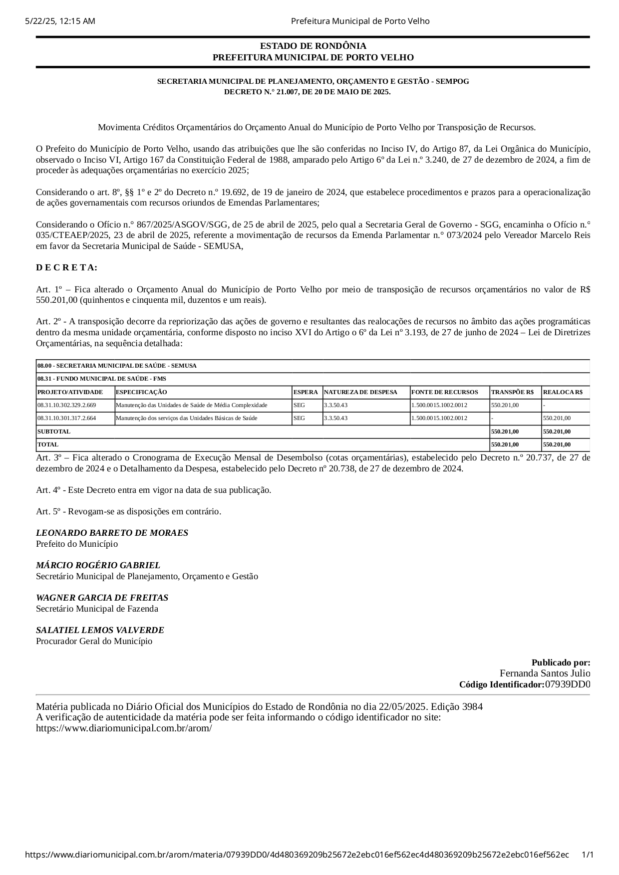 Porto Velho, RO, 21/05/2025 – Em meio a cobranças da oposição sobre a precariedade da rede de saúde, o prefeito Léo Moraes (PODE) assinou o Decreto n° 21.007, que realoca R$ 550.201,00 de uma emenda do ex-vereador Marcelo Reis para as Unidades Básicas de Saúde (UBS). A medida surge dias após críticas públicas dos vereadores Marcos Combate (AGIR), Nilton Souza (PSDB) e Fernando Silva (REPU) sobre a falta de medicamentos e manutenção nas unidades.