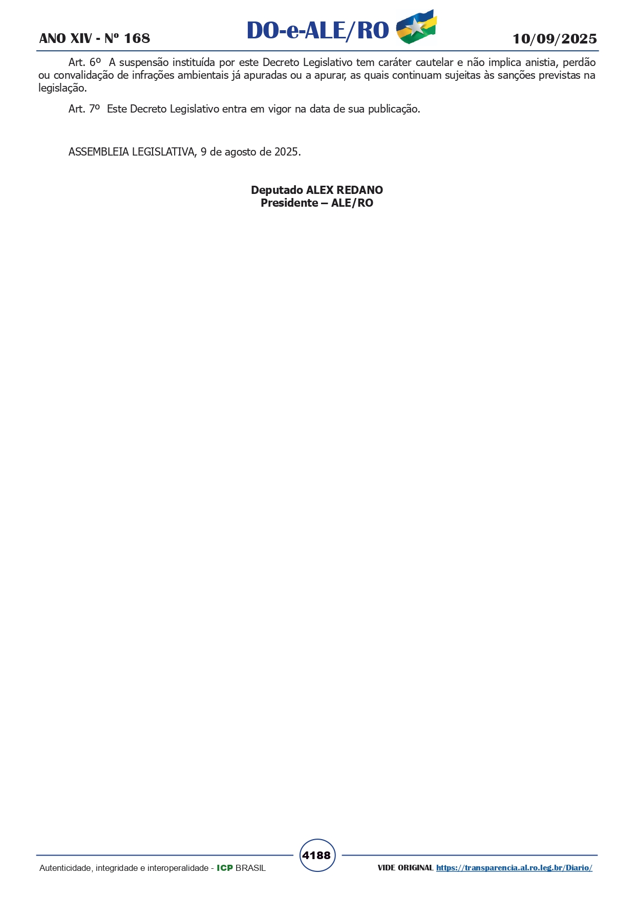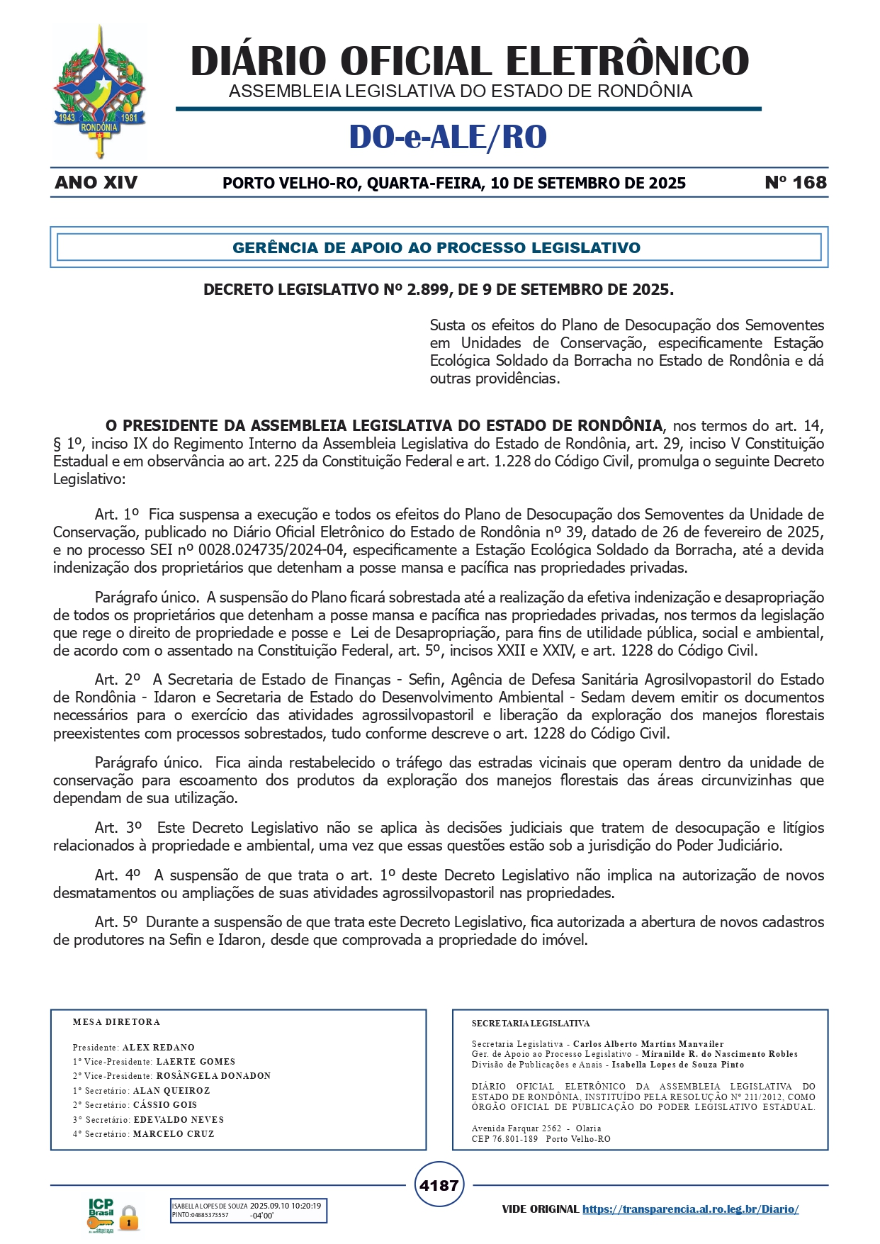 O presidente da Assembleia Legislativa de Rondônia, deputado Alex Redano, assinou e promulgou nesta quarta-feira (10) o Decreto Legislativo nº 2.899, que suspende os efeitos do Plano de Desocupação dos Semoventes na Estação Ecológica Soldado da Borracha. A decisão só permite a continuidade do processo depois que os proprietários e posseiros da área forem devidamente indenizados.