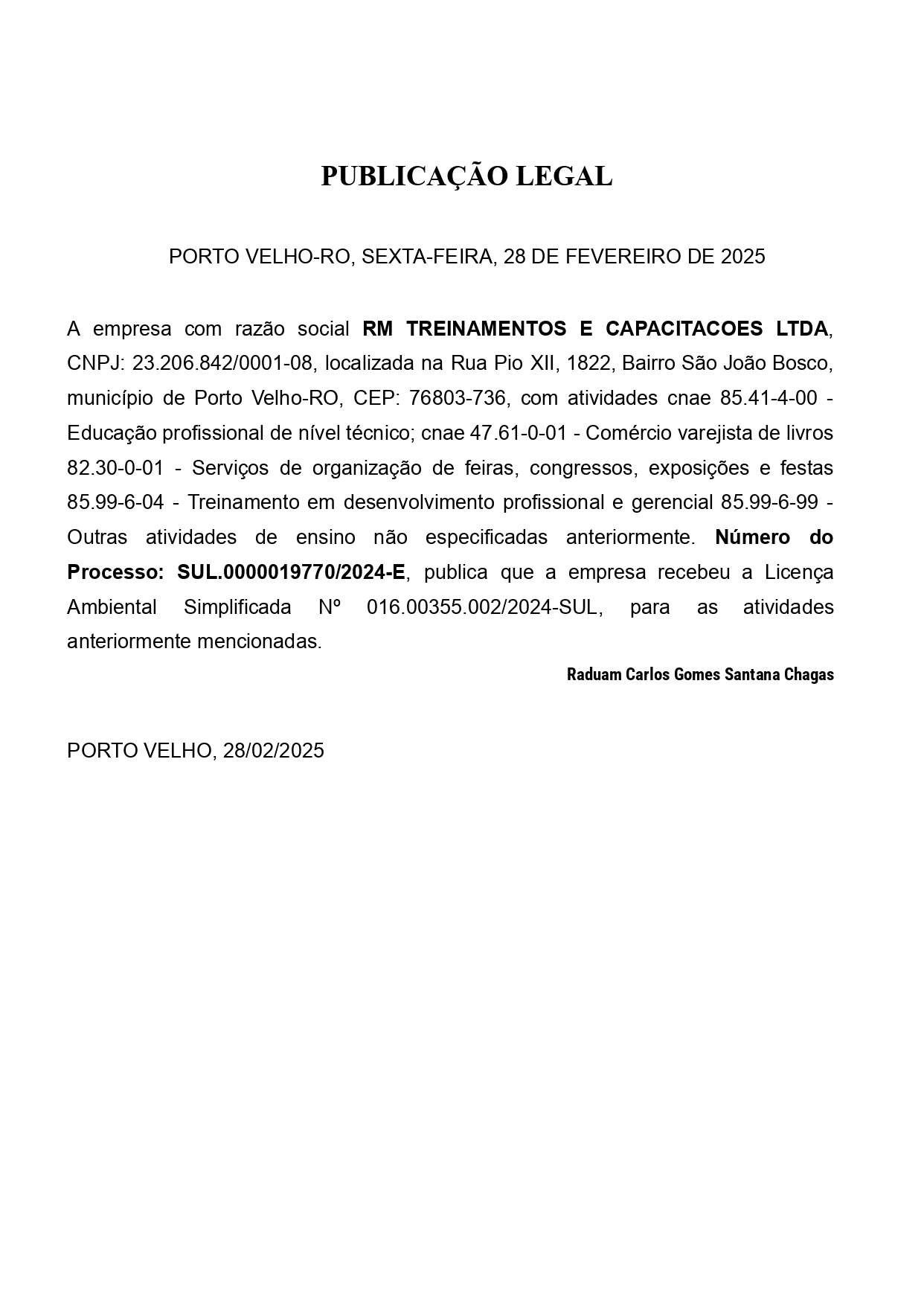 A empresa com razão social RM TREINAMENTOS E CAPACITACOES LTDA, CNPJ: 23.206.842/0001-08, localizada na Rua Pio XII, 1822, Bairro São João Bosco, município de Porto Velho-RO, CEP: 76803-736, com atividades cnae 85.41-4-00 – Educação profissional de nível técnico; cnae 47.61-0-01 – Comércio varejista de livros 82.30-0-01 – Serviços de organização de feiras, congressos, exposições e festas 85.99-6-04 – Treinamento em desenvolvimento profissional e gerencial 85.99-6-99 – Outras atividades de ensino não especificadas anteriormente. Número do Processo: SUL.0000019770/2024-E, publica que a empresa recebeu a Licença Ambiental Simplificada Nº 016.00355.002/2024-SUL, para as atividades anteriormente mencionadas.