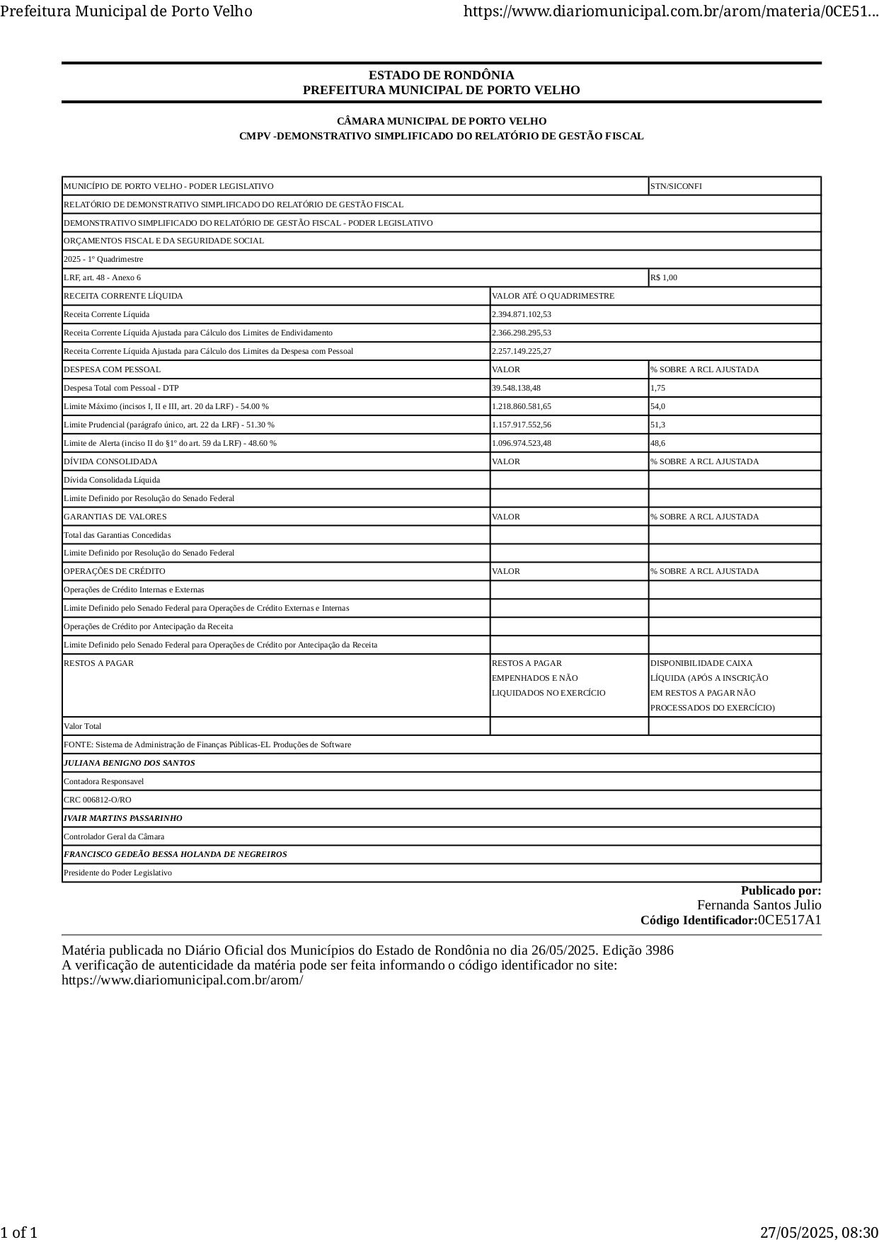 A Prefeitura de Porto Velho registrou uma Receita Corrente Líquida de R$ 2.394.871.102,53 (dois bilhões, trezentos e noventa e quatro milhões, oitocentos e setenta e um mil, cento e dois reais e cinquenta e três centavos) até o primeiro quadrimestre de 2025, segundo relatório oficial divulgado pela Câmara Municipal de Porto Velho no Diário Oficial dos Municípios.