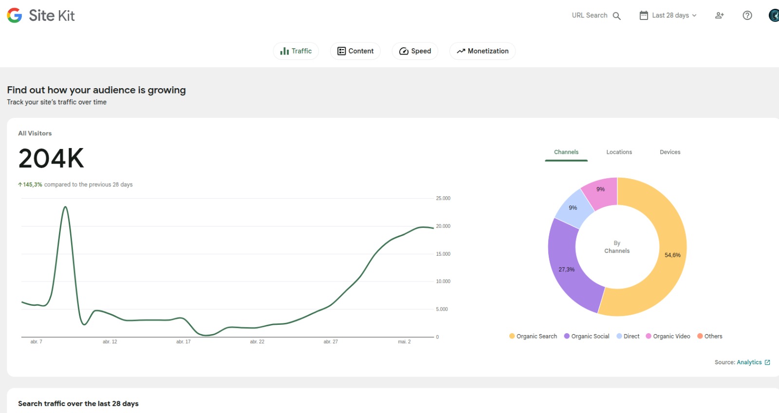 O gráfico de visitas mostra um pico no início de abril, seguido por uma queda leve, e então uma retomada constante até o começo de maio. Esse movimento aponta não só para um conteúdo que engaja, mas também para uma audiência em expansão, que chega e permanece.