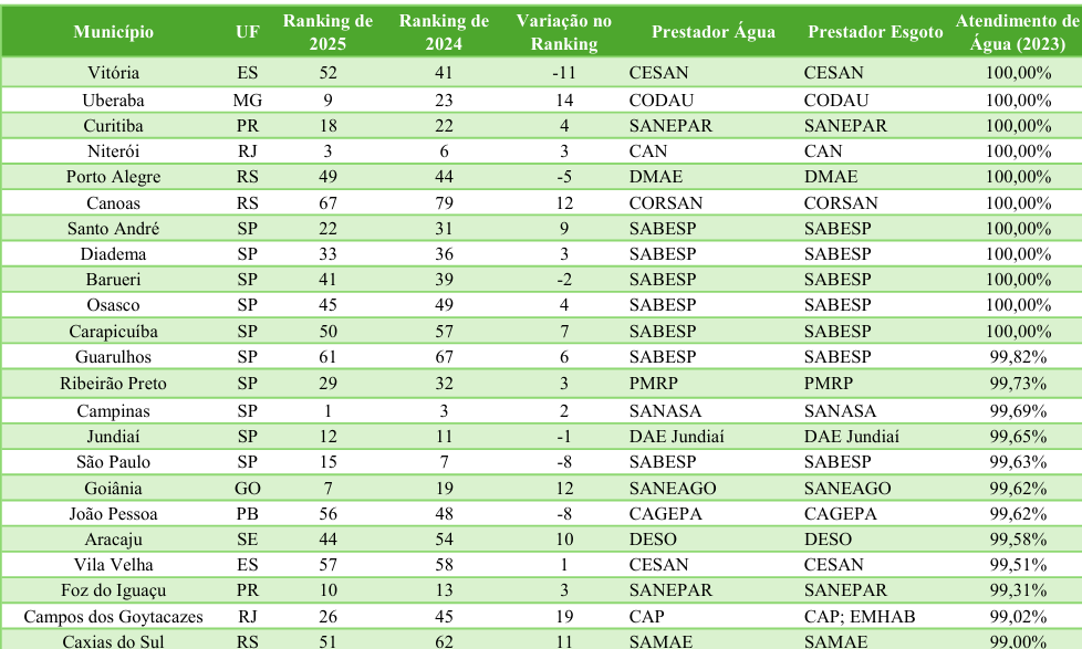 No entanto, apesar dos avanços ainda necessários, muitos municípios têm feito sua parte e investido na oferta de água para suas populações. De acordo com a 17ª edição do Ranking do Saneamento (SINISA, ano-base 2023), que analisa os 100 municípios mais populosos do Brasil, 23 já universalizaram o acesso à água potável. São considerados universalizados, de acordo com a Lei nº 14.026/20, os municípios que atendem a 99% ou mais da população com abastecimento de água potável.