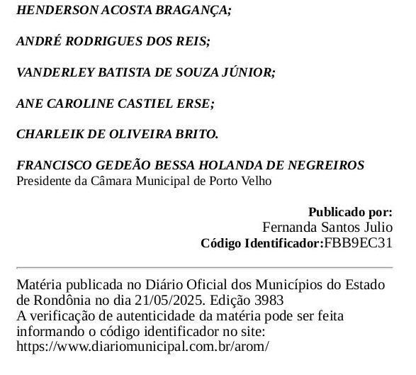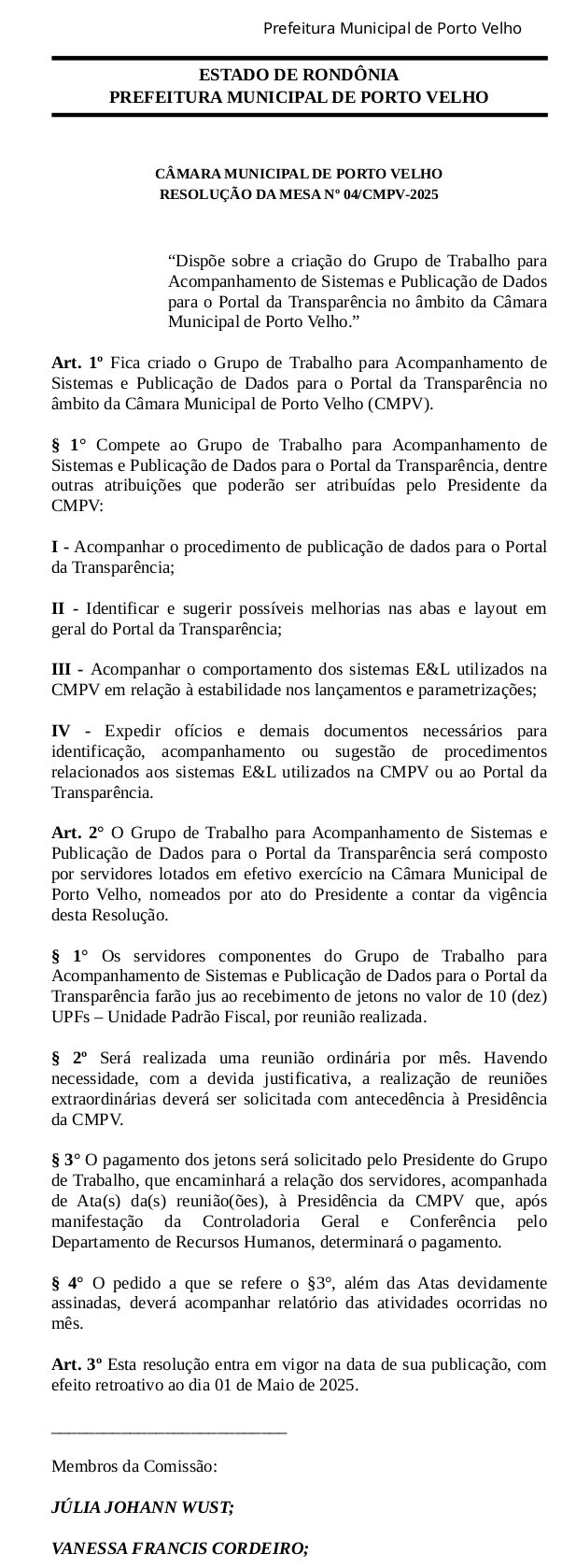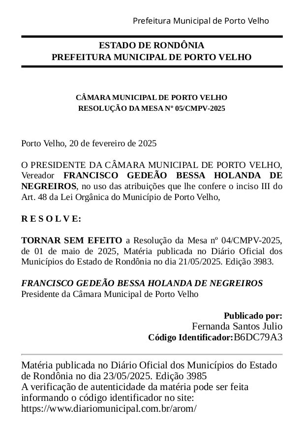 PORTO VELHO (RO) — A Câmara Municipal de Porto Velho tornou sem efeito a Resolução da Mesa n.º 04/CMPV-2025, que instituía o GRUPO DE TRABALHO PARA ACOMPANHAMENTO DE SISTEMAS E PUBLICAÇÃO DE DADOS PARA O PORTAL DA TRANSPARÊNCIA. A revogação foi oficializada por meio da Resolução da Mesa n.º 05/CMPV-2025, assinada pelo presidente da Casa, vereador Francisco Gedeão Bessa Holanda de Negreiros, e publicada no Diário Oficial dos Municípios do Estado de Rondônia nesta sexta-feira (23/05/2025), edição 3985.