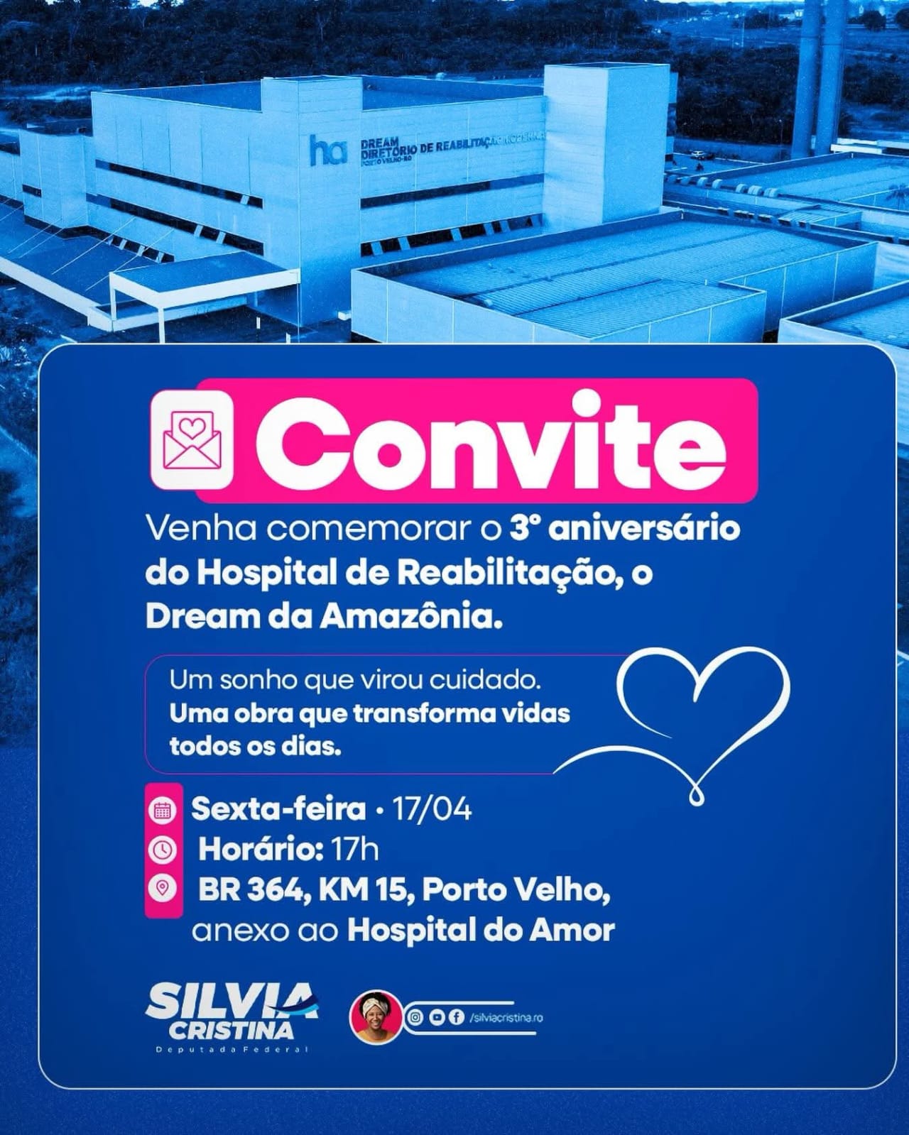 “Convidar a todos para este momento de comemoração do trabalho do Centro de Reabilitação, que tem resgatado vidas há três anos, graças ao investimento de R$ 60 milhões de nosso mandato, na parceria com a fundação Pio XII, assegurando o mais moderno espaço de reabilitação do país”, disse a deputada.