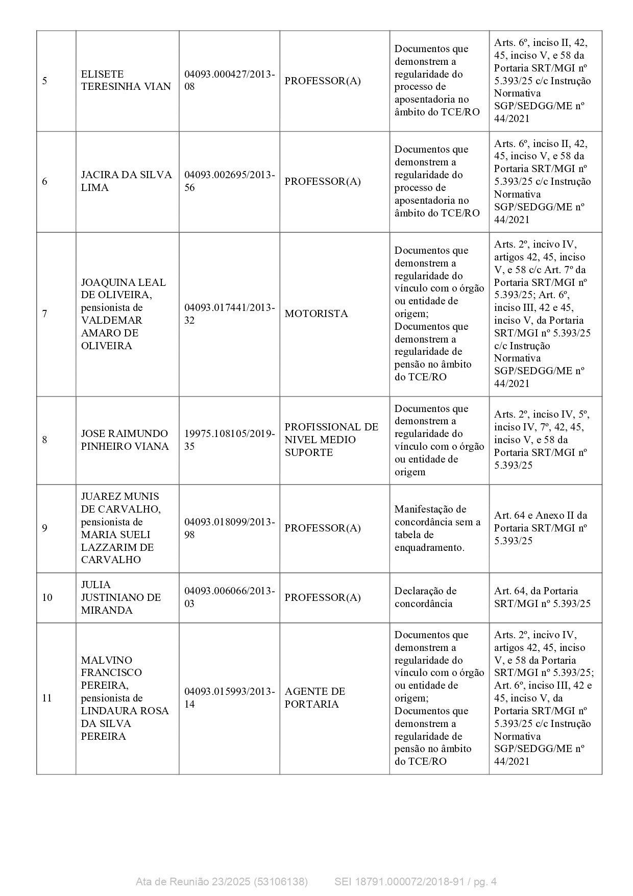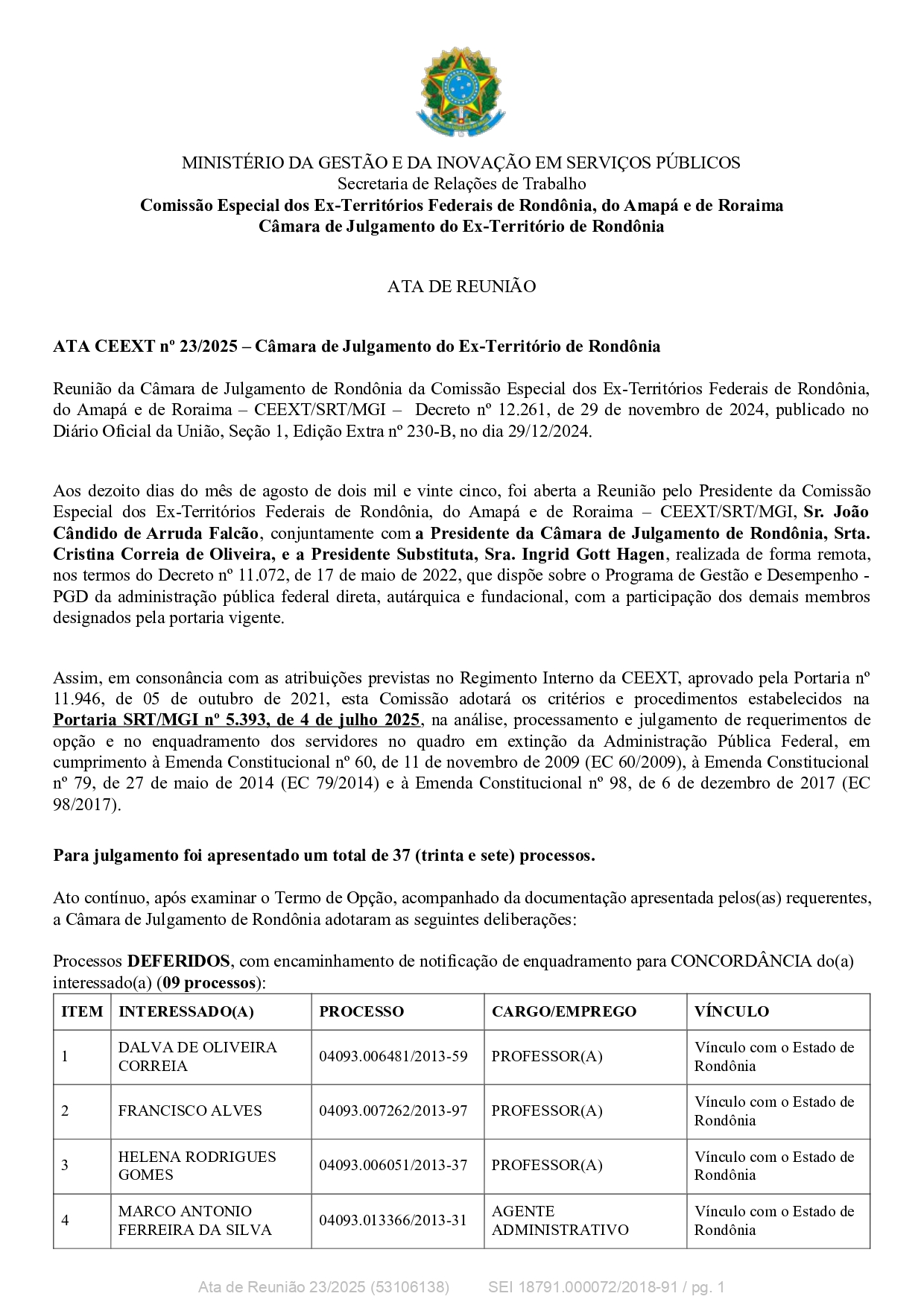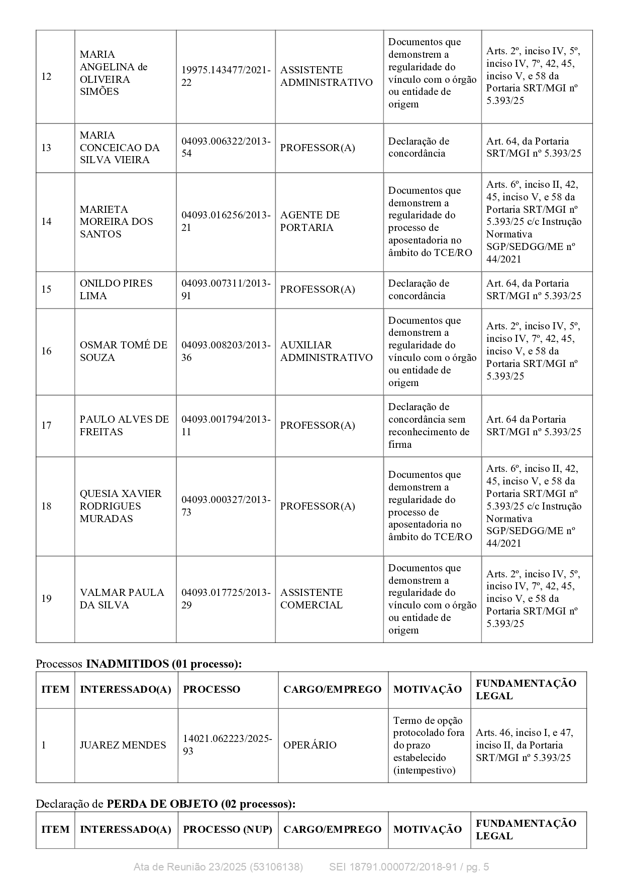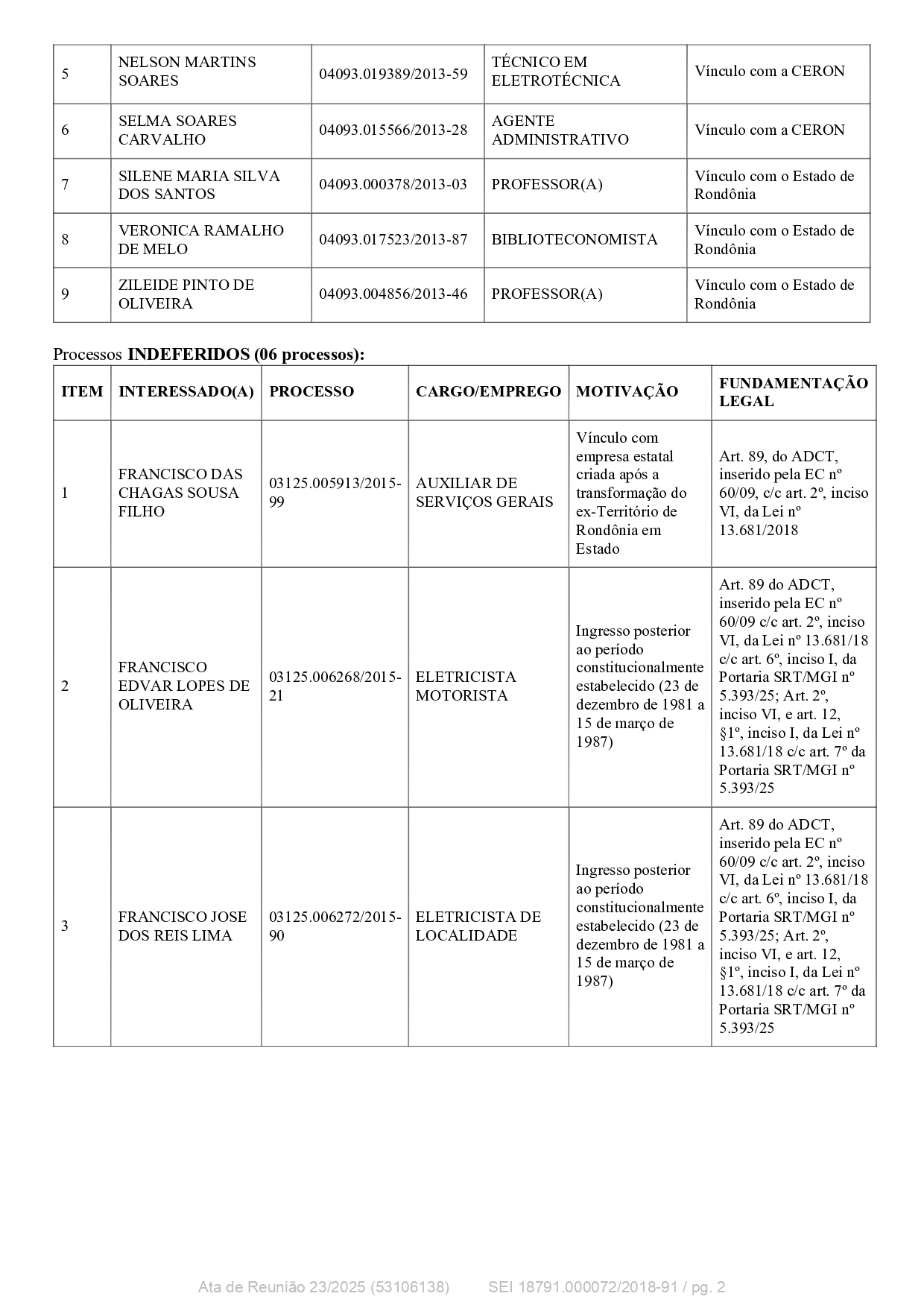 Entre os processos deferidos, com encaminhamento de notificação de enquadramento para concordância do(a) interessado(a), destacam-se nove casos: Dalva de Oliveira Correia, Francisco Alves, Helena Rodrigues Gomes, Marco Antônio Ferreira da Silva, Nelson Martins Soares, Selma Soares Carvalho, Silene Maria Silva dos Santos, Verônica Ramalho de Melo e Zileide Pinto de Oliveira, ocupando cargos de professores, agentes administrativos, técnico em eletrotécnica e biblioteconista, com vínculo com o Estado de Rondônia ou CERON. Foram indeferidos seis processos, devido a ingresso posterior ao período constitucionalmente estabelecido ou vínculo com empresa estatal criada após a transformação do ex-Território de Rondônia em Estado. Entre os indeferidos estão Francisco das Chagas Sousa Filho, Francisco Edvar Lopes de Oliveira, Francisco José dos Reis Lima, Gelber José Barbosa Gomes, Josué Pinheiro da Silva e Zila Auxiliadora Corona Rotta, exercendo funções de auxiliar de serviços gerais, eletricista, auxiliar financeiro e professor(a), com fundamentação legal detalhada na Portaria SRT/MGI nº 5.393/2025 e no ADCT, conforme a Emenda Constitucional nº 60/2009.