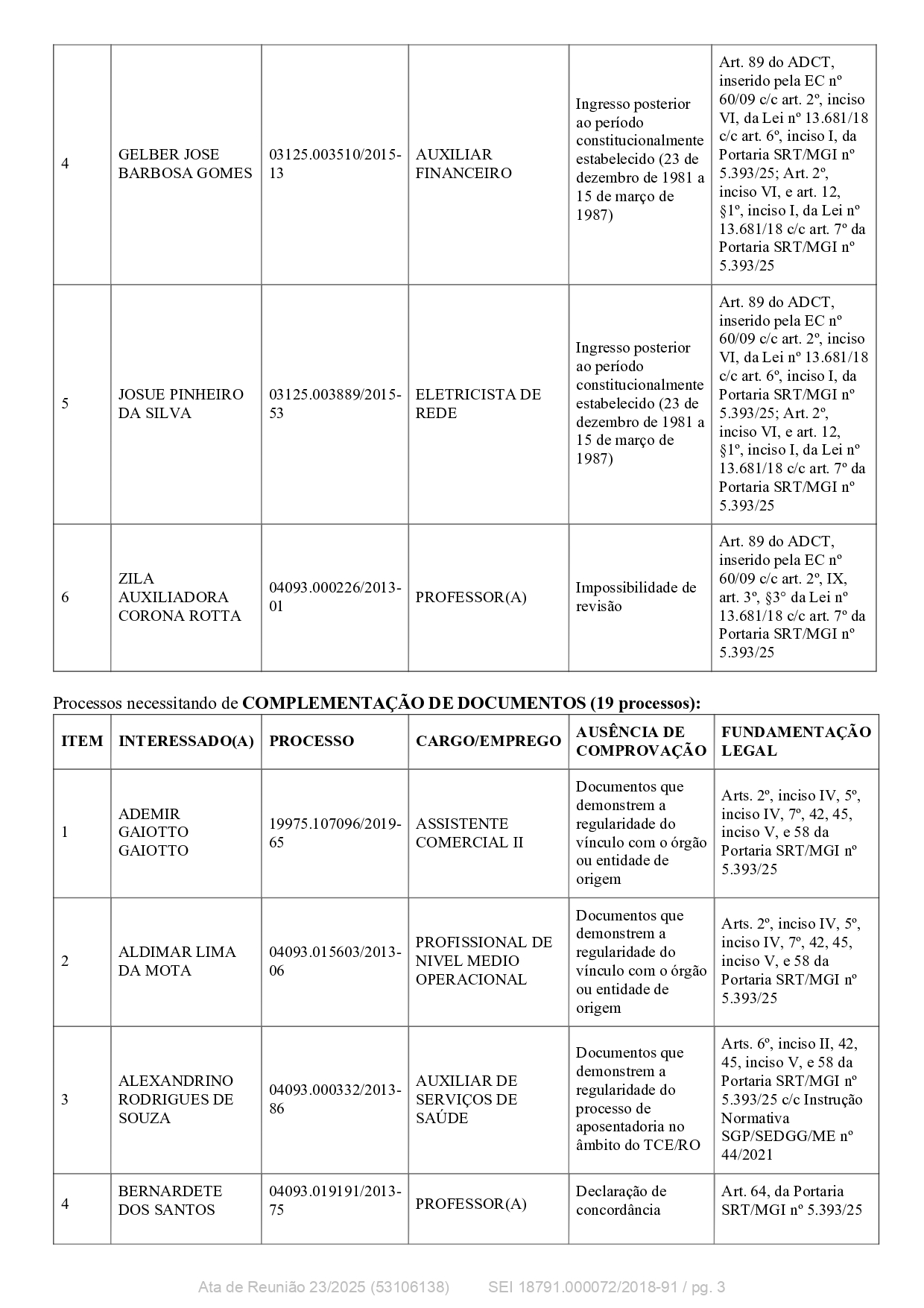 Dezenove processos necessitaram de complementação de documentos, requerendo comprovação da regularidade do vínculo com o órgão ou entidade de origem ou documentação relacionada ao processo de aposentadoria no âmbito do TCE/RO, incluindo Ademir Gaiotto Gaiotto, Aldimar Lima da Mota, Alexandrino Rodrigues de Souza, Bernardete dos Santos, Elisete Teresinha Vian, Jacira da Silva Lima, Joaquina Leal de Oliveira (pensionista de Valdemar Amaro de Oliveira), José Raimundo Pinheiro Viana, Juarez Munis de Carvalho (pensionista de Maria Sueli Lazzarim de Carvalho), Julia Justiniano de Miranda, Malvino Francisco Pereira (pensionista de Lindaura Rosa da Silva Pereira), Maria Angelina de Oliveira Simões, Maria Conceição da Silva Vieira, Marieta Moreira dos Santos, Onildo Pires Lima, Osmar Tomé de Souza, Paulo Alves de Freitas, Quesia Xavier Rodrigues Muradas e Valmar Paula da Silva.