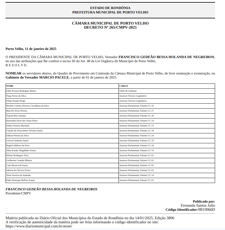 Porto Velho – O presidente da Câmara Municipal de Porto Velho, vereador Francisco Gedeão Bessa Holanda de Negreiros, consoante o inciso III do Art. 48 da Lei Orgânica do Município, oficializou a nomeação de servidores para o gabinete do vereador MÁRCIO PACELE. As nomeações, de livre provimento e exoneração, entram em vigor a partir de 1º de janeiro de 2025.