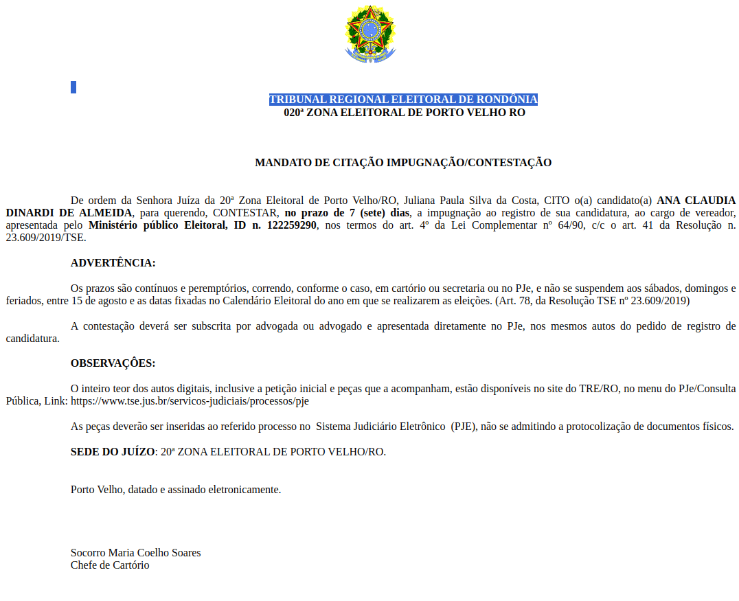 O Tribunal Regional Eleitoral de Rondônia (TRE-RO) informou que a candidatura de Ana Claudia Dinardi de Almeida, que concorre ao cargo de vice-prefeita em Porto Velho, está sendo contestada. A Juíza da 20ª Zona Eleitoral, Juliana Paula Silva da Costa, notificou a candidata, dando-lhe um prazo de sete dias para apresentar sua defesa.